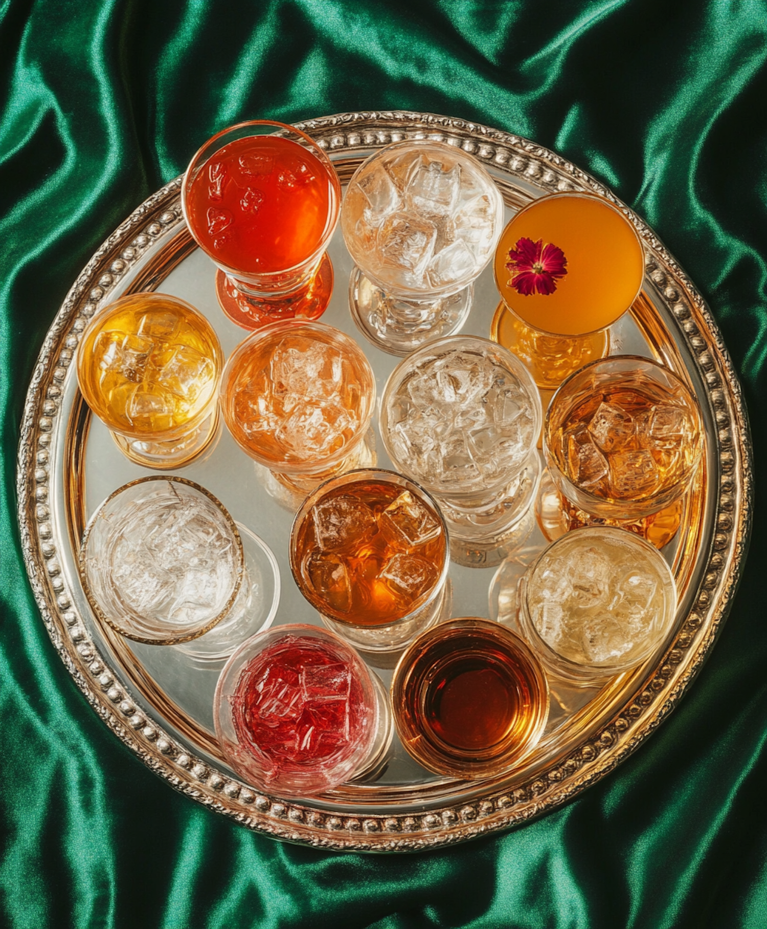 Elegant cocktail assortment on a silver tray with vibrant colors and ice, set against a rich green satin background.