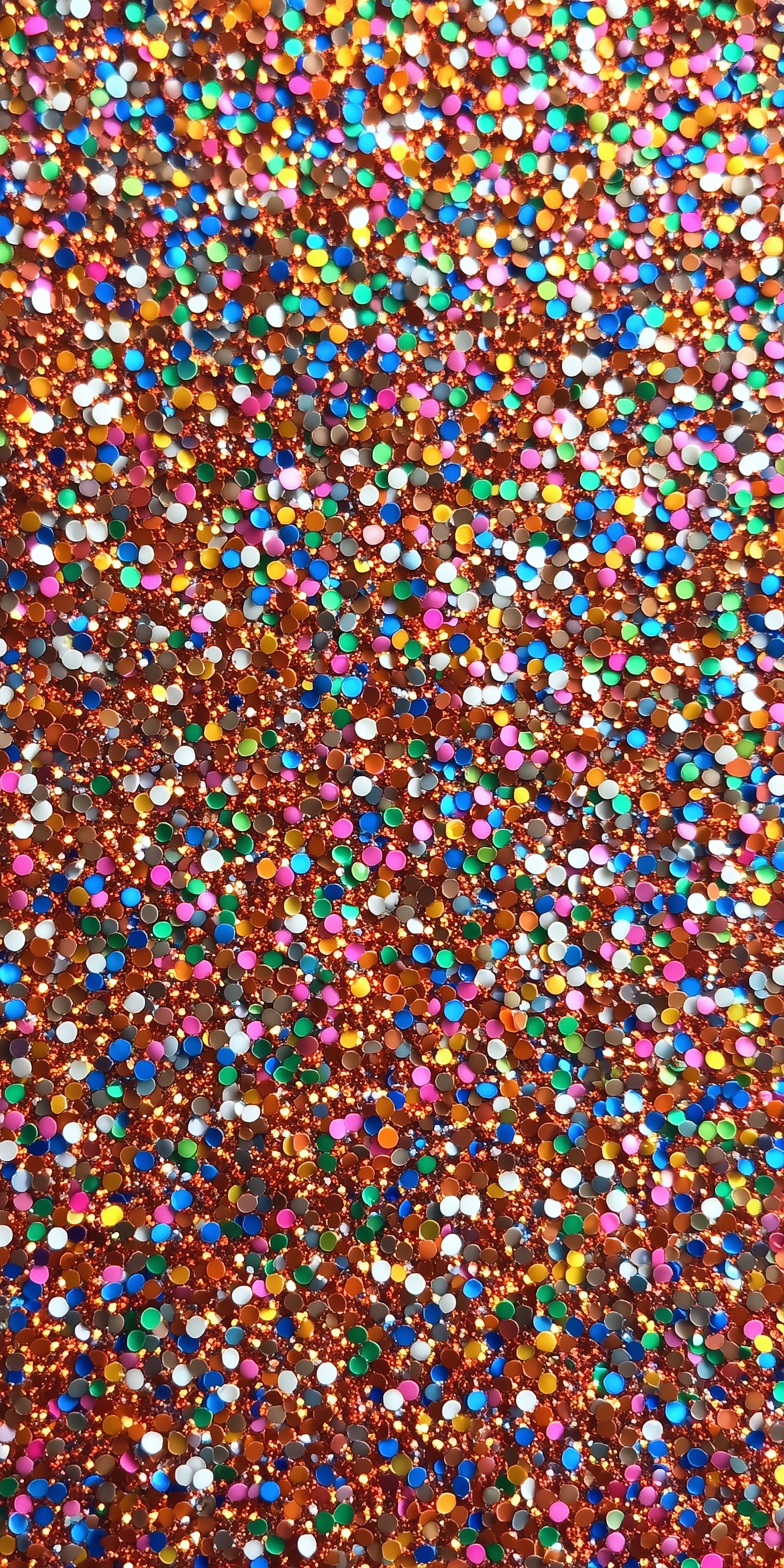 Bright and colorful glitter confetti on a coppery-orange background, creating a sparkling and festive visual texture.