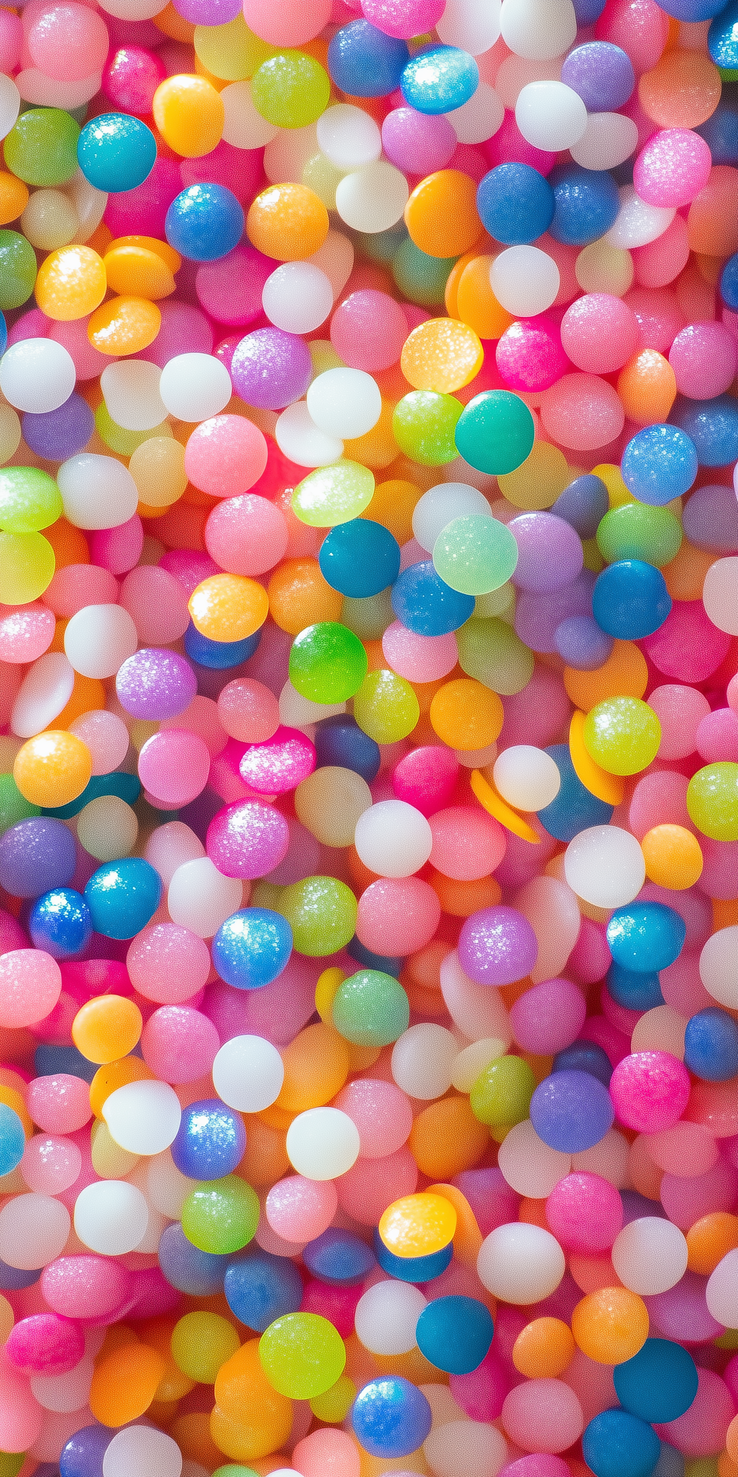 Bright and colorful close-up of glossy, round objects in pink, blue, green, and more, with some featuring a glittery texture.