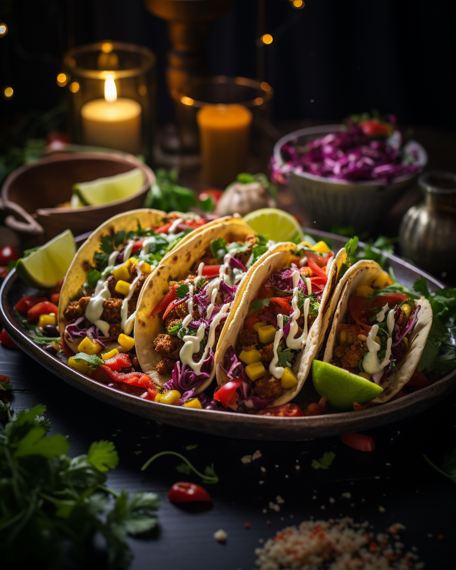 Vibrant tacos with colorful fillings and creamy sauce on a rustic table, surrounded by candlelight and fresh ingredients.