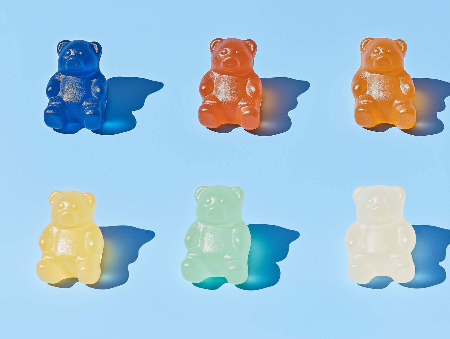Colorful gummy bears arranged on a bright blue background, showcasing vibrant hues and playful shadows.
