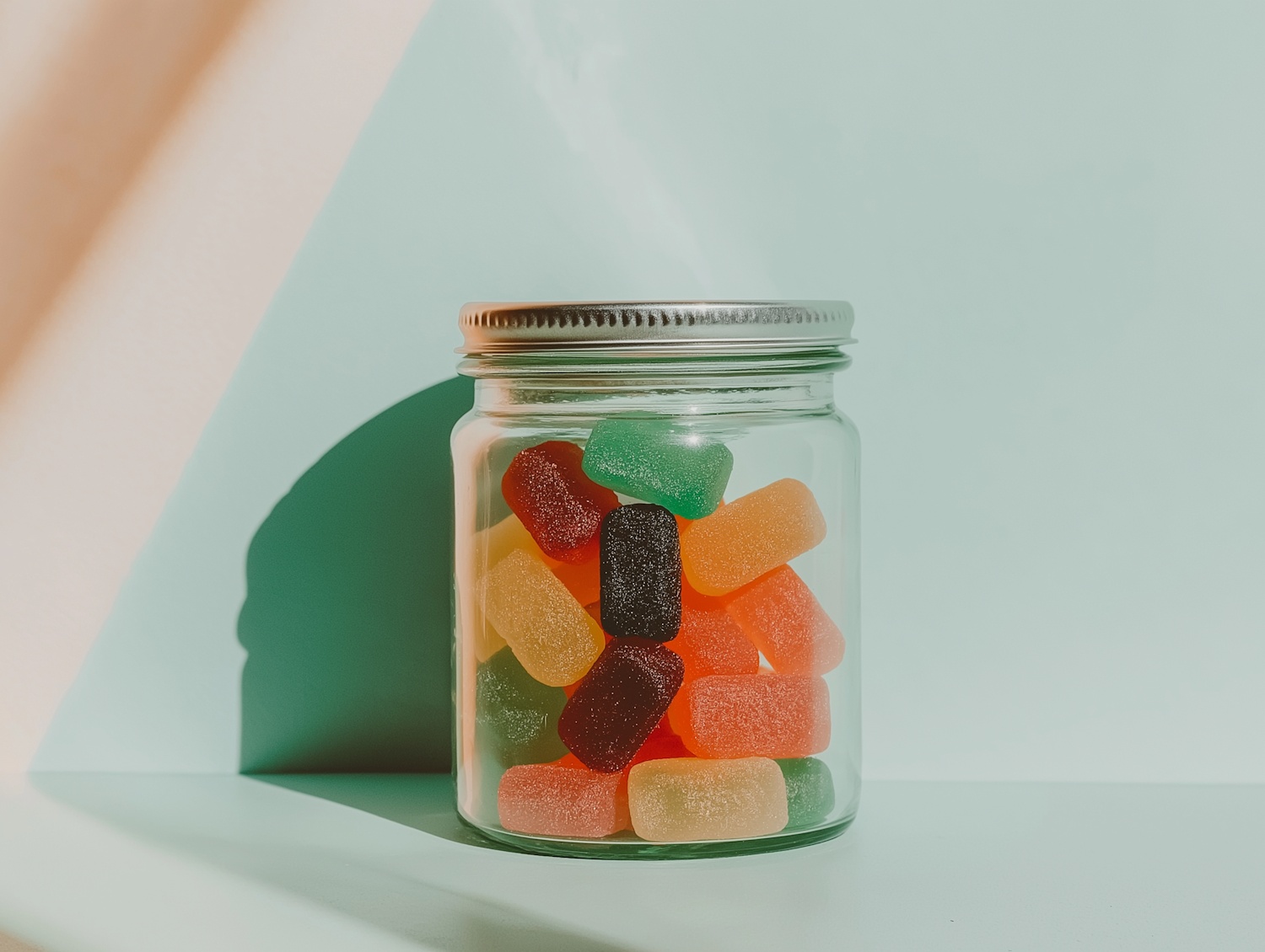 A jar filled with colorful gummy candies on a pastel green background, casting a soft shadow. Vibrant and visually appealing.