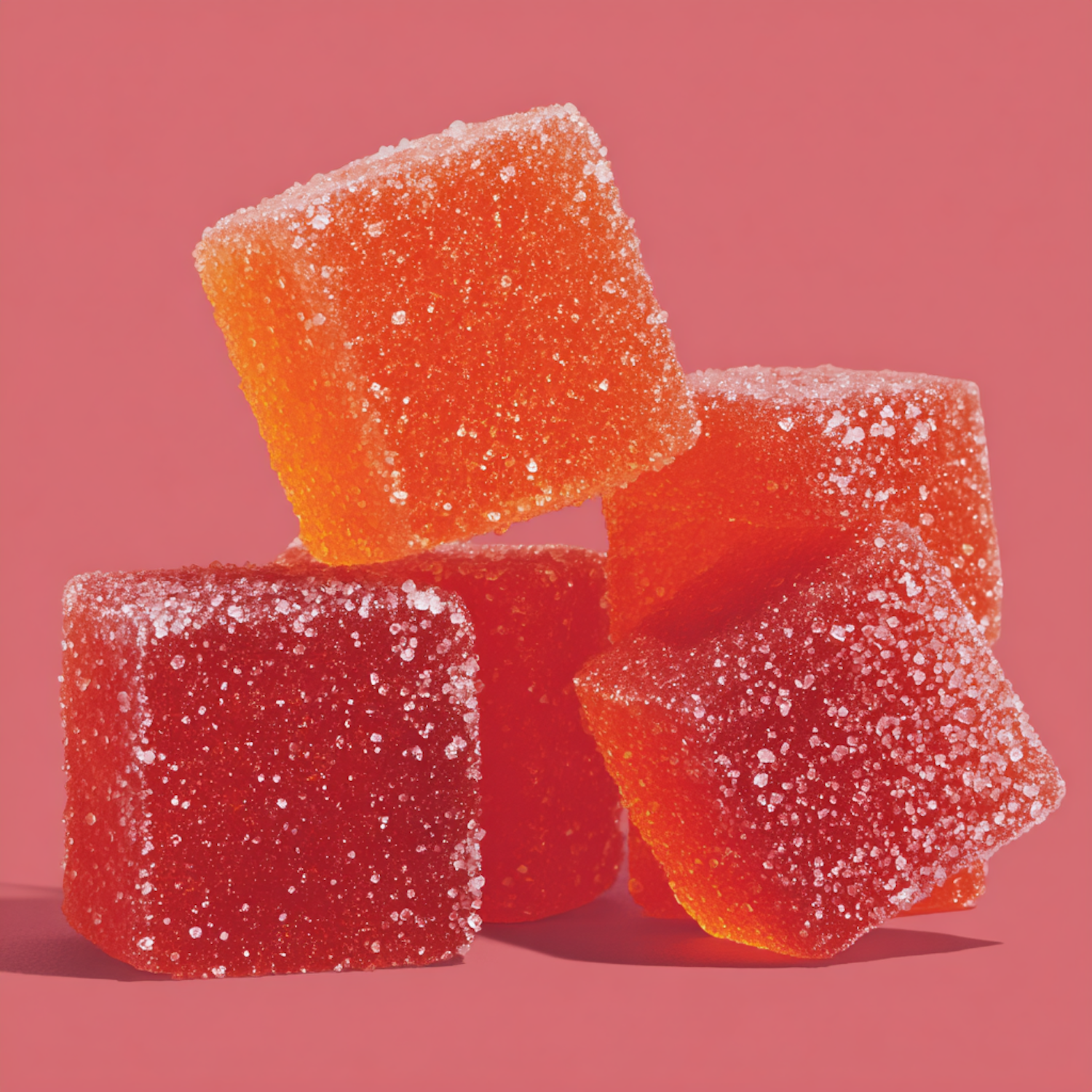 Bright and colorful sugar-coated gummy cubes stacked against a pink background, showcasing their vibrant orange and red hues.