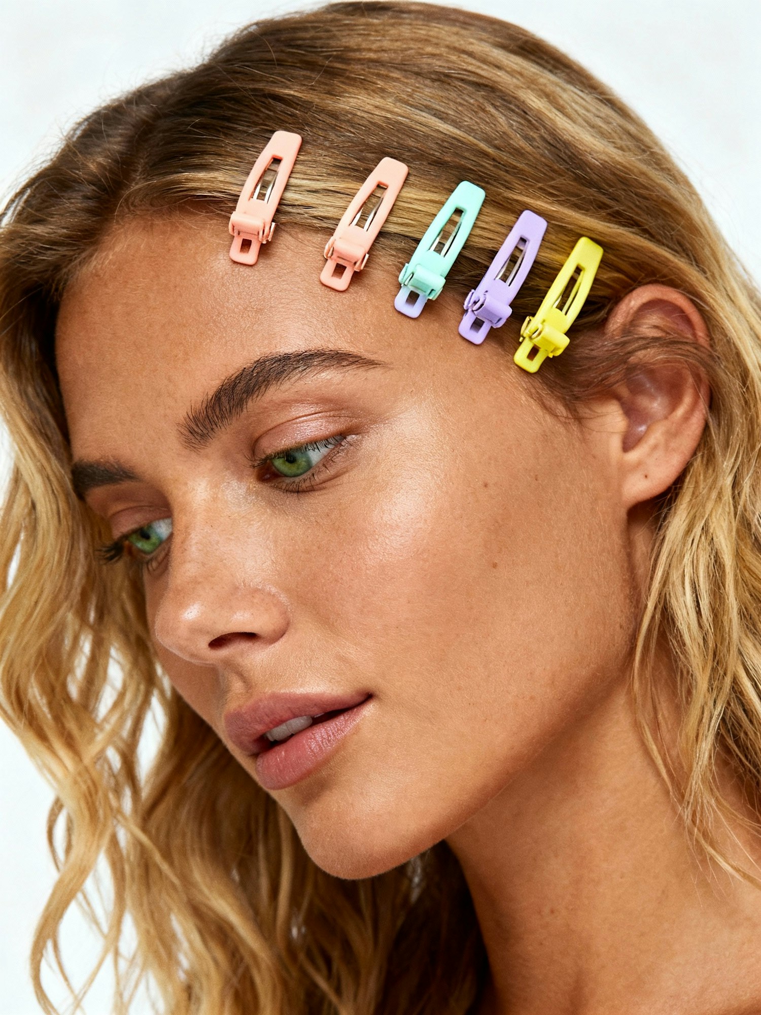 Studio portrait, plain white seamless background, soft even lighting, clean editorial aesthetic, no shadows, high detail, realistic photography, sharp focus on face and hair accessories Portrait of a young blonde woman with tanned skin and light green eyes, wavy hair left loose. She faces three-quarter to the left, gaze slightly downward. Thin strands along her temples are clipped with pastel mini claw clips in colors like peach, mint, lavender, and yellow, forming two vertical rows down both sides of her face.