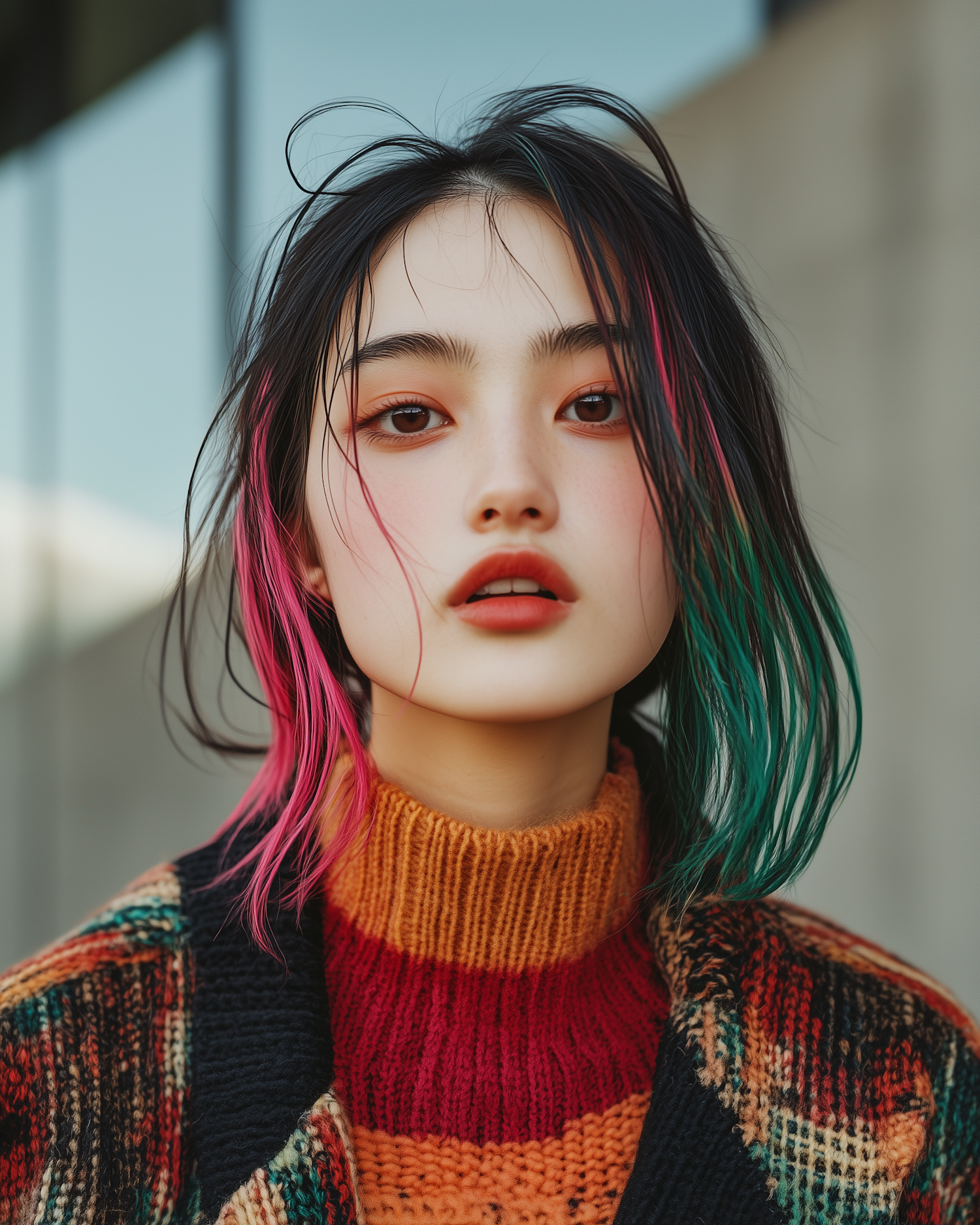 Close-up portrait of an Asian woman with vibrant pink and green hair highlights, wearing a colorful sweater.