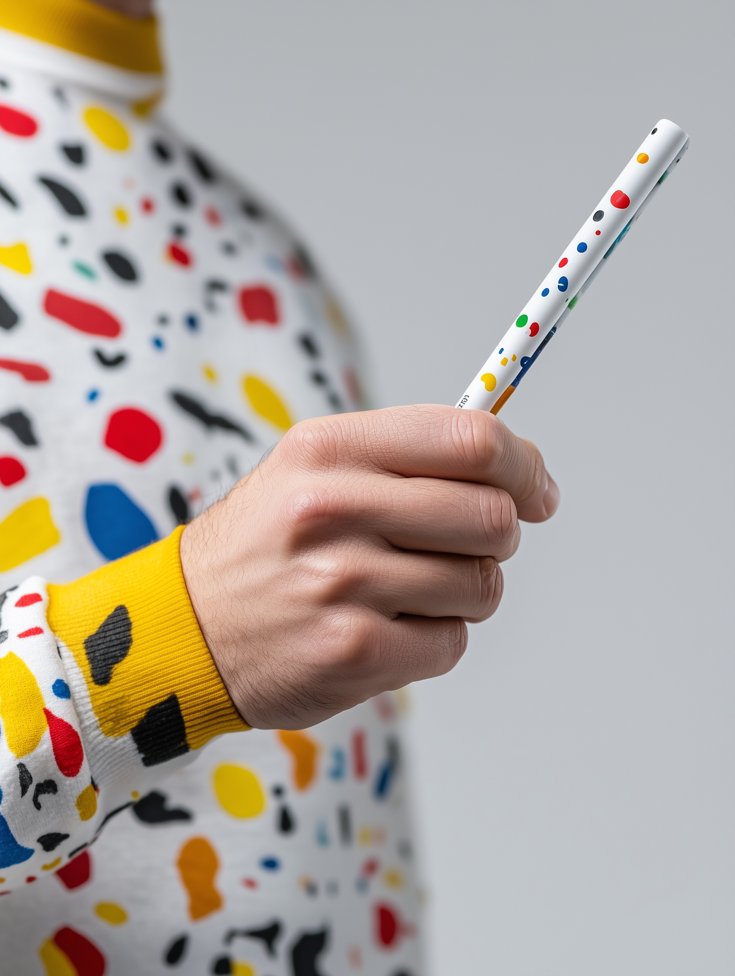 Close-up of a hand holding a colorful dotted pen, wearing a matching dotted sweater with vibrant colors.