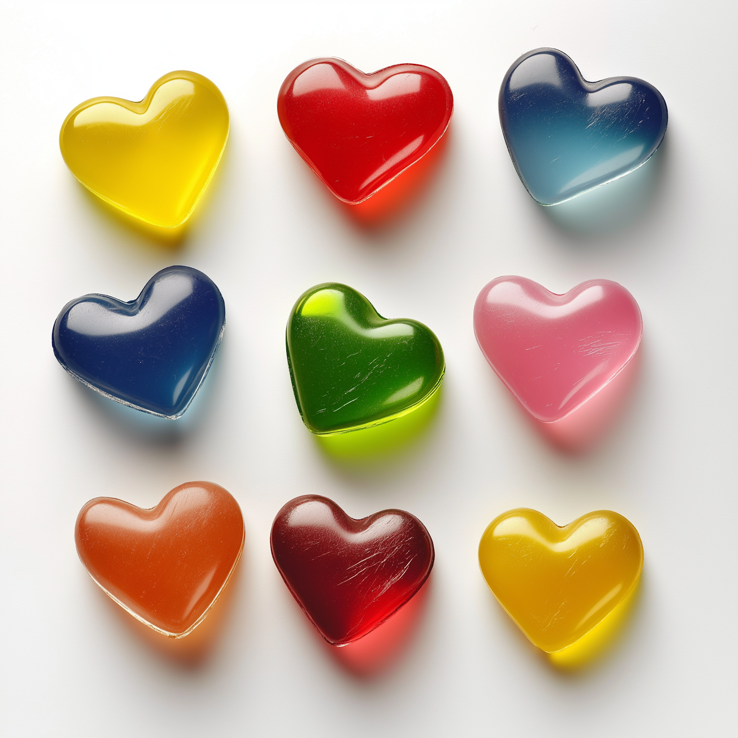 Bright and colorful heart-shaped candies in a 3x3 grid, featuring glossy textures and vibrant hues on a clean white background.