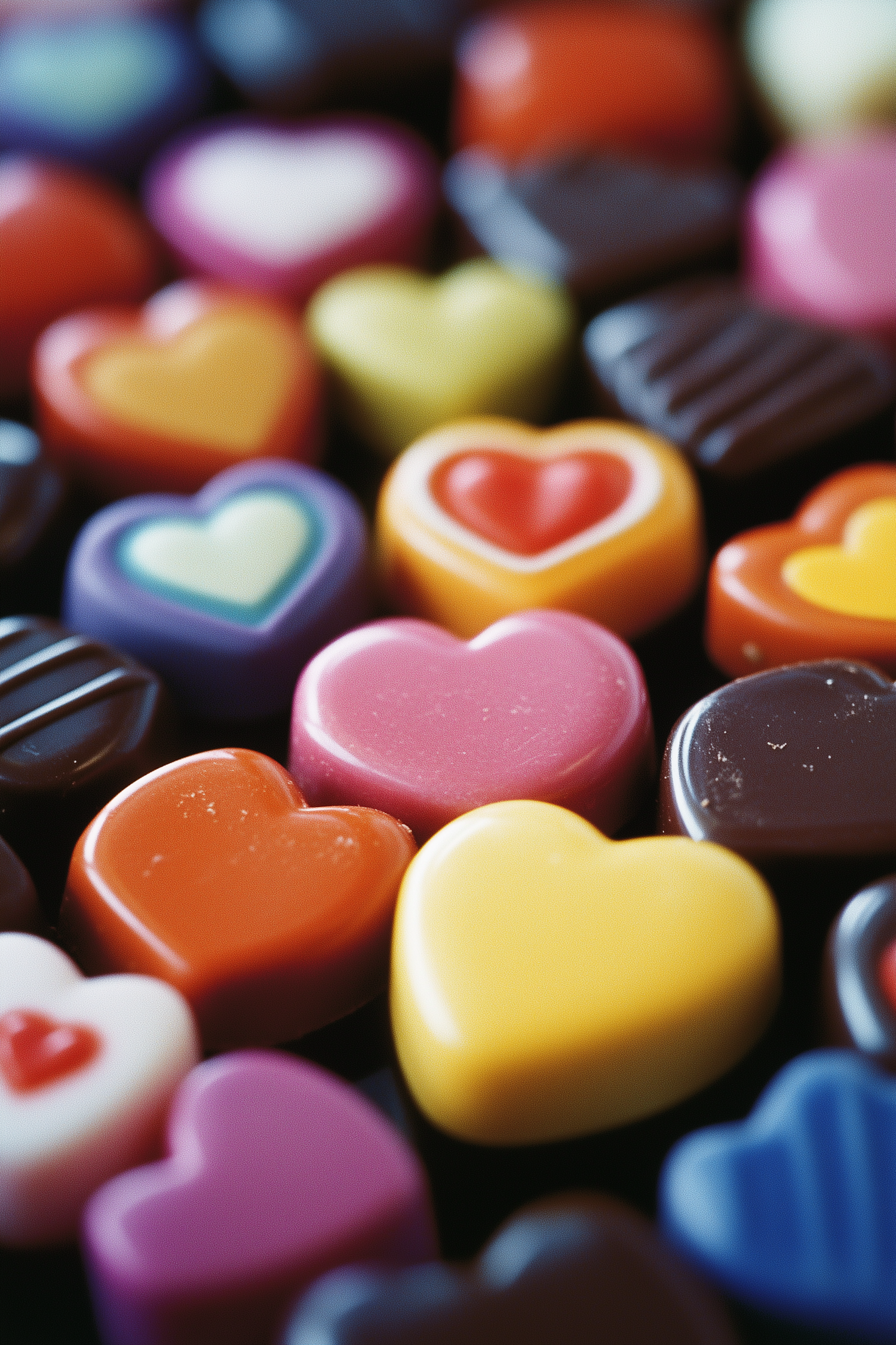 Colorful heart-shaped chocolates in various designs create a vibrant and sweet mosaic, perfect for romantic or festive themes.