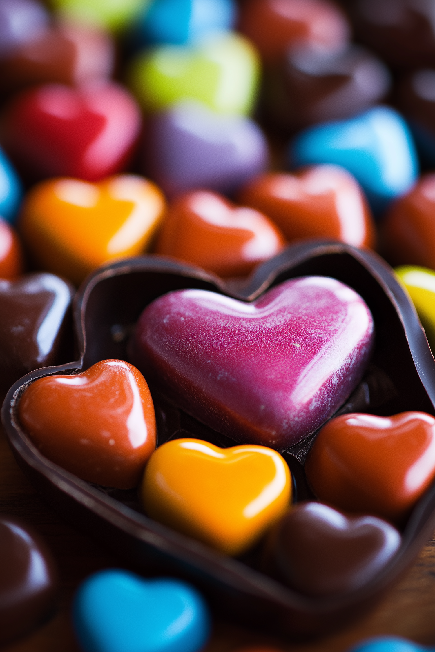 Vibrant heart-shaped chocolates in various colors, centered around a glossy pink heart in a dark chocolate shell.