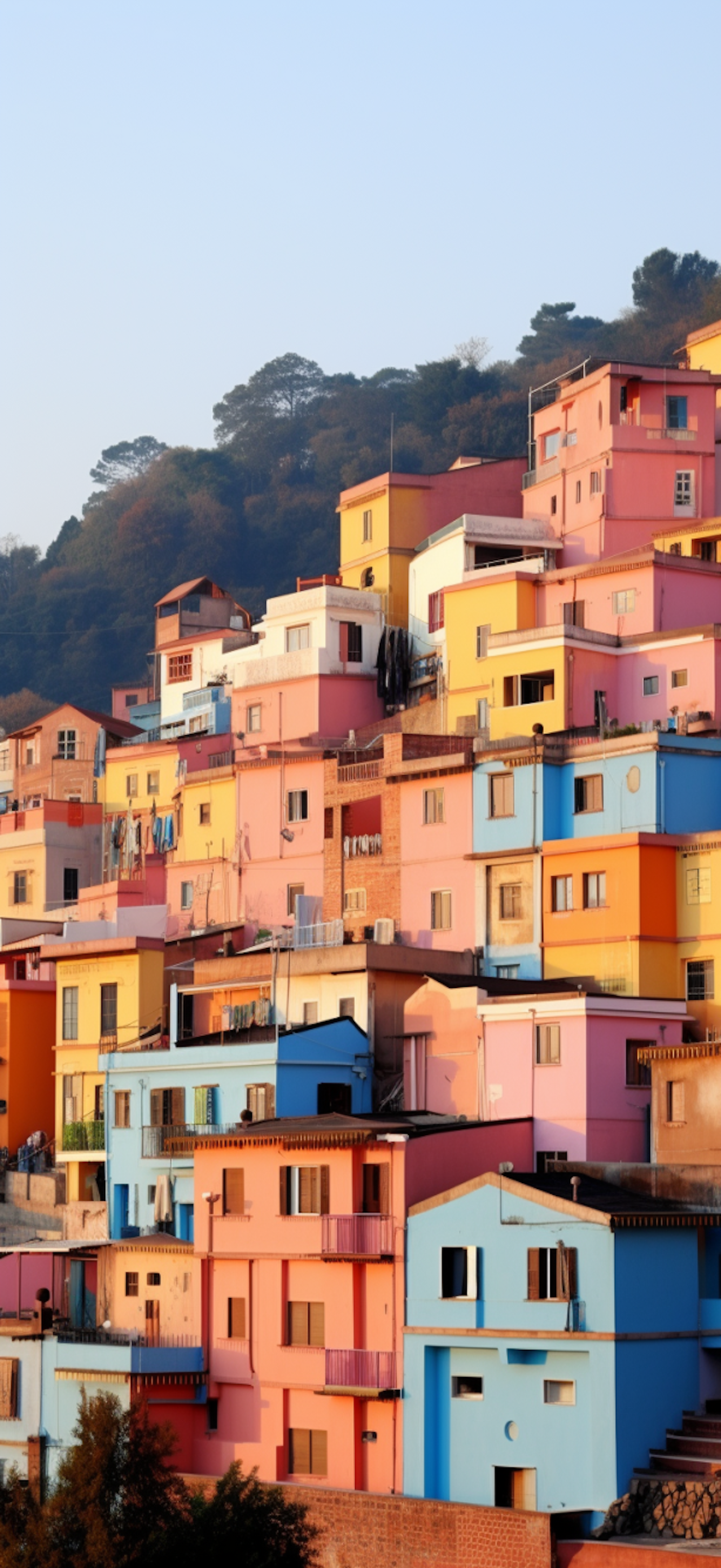 Colorful hillside houses create a vibrant mosaic against a lush green backdrop, showcasing a lively and artistic community.