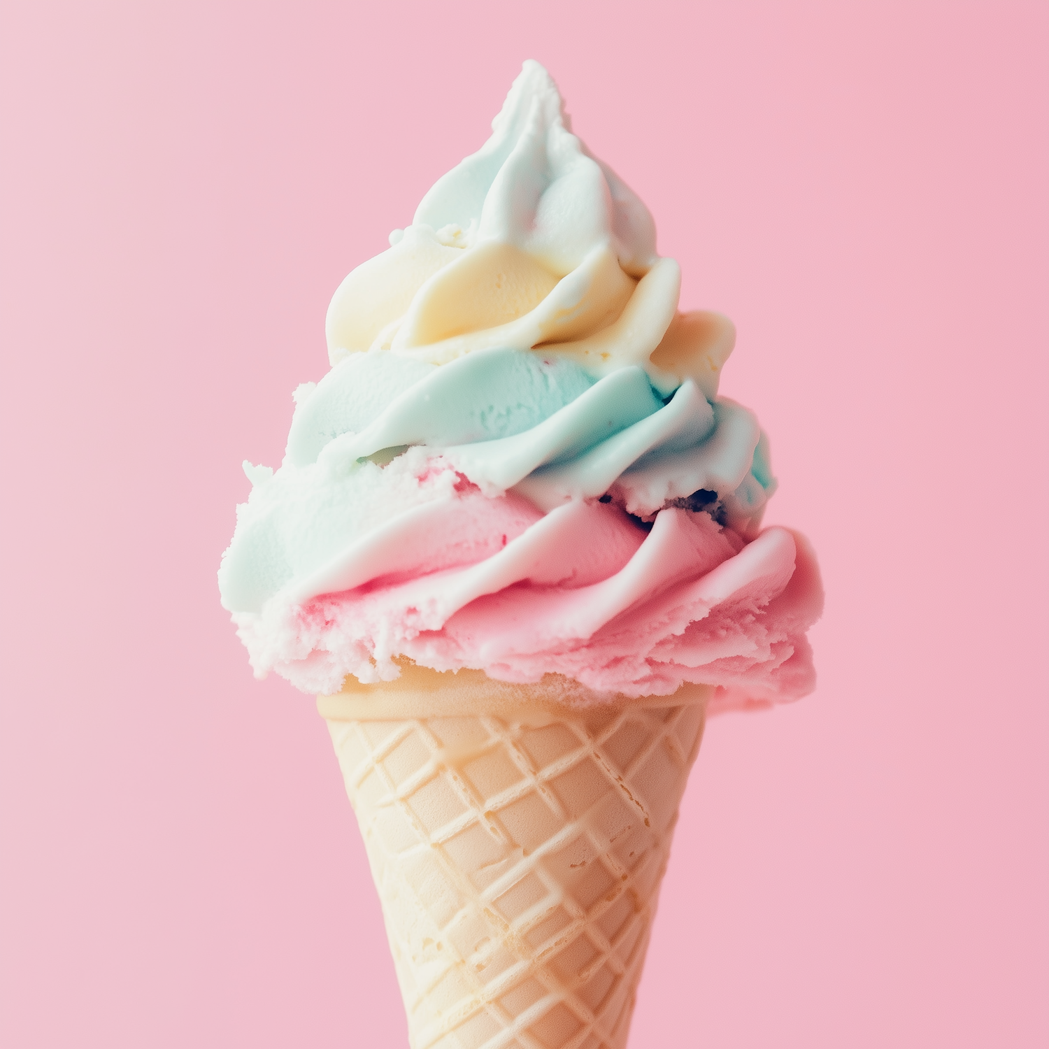 A pastel ice cream cone with swirls of pink, blue, and yellow against a soft pink background. Perfect for summer vibes and sweet cravings!
