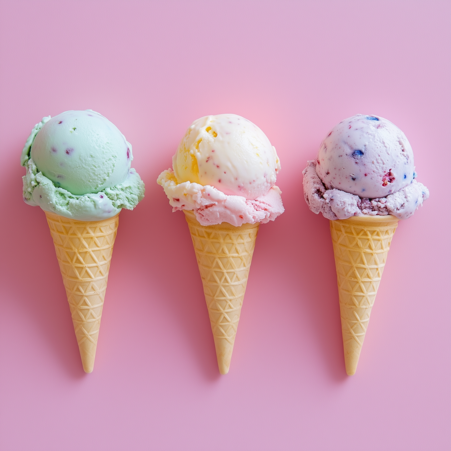 Three colorful ice cream cones on a pastel pink background, featuring mint, vanilla swirl, and berry flavors. Perfect summer treat!