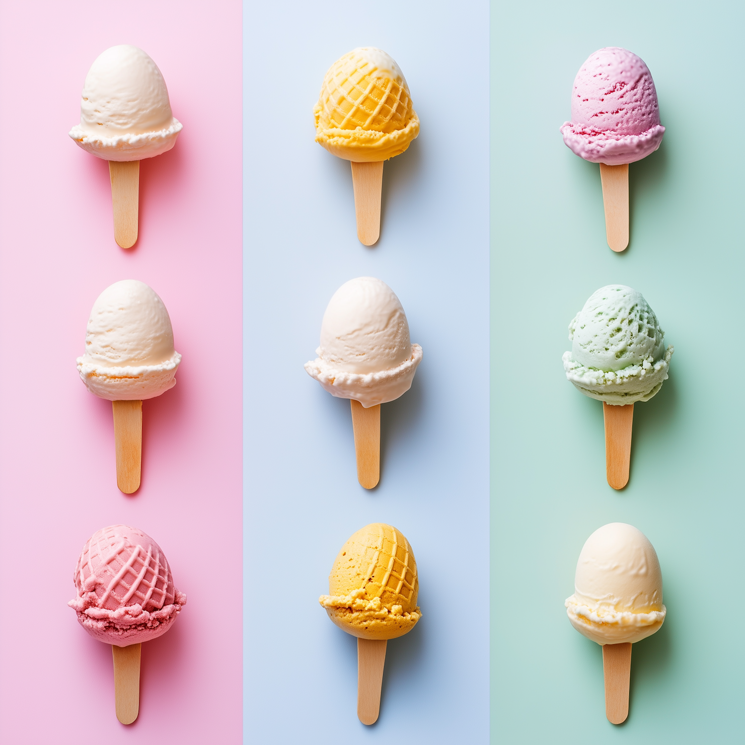 Colorful ice cream scoops on sticks against pastel backgrounds, featuring flavors like vanilla, strawberry, mango, and mint.