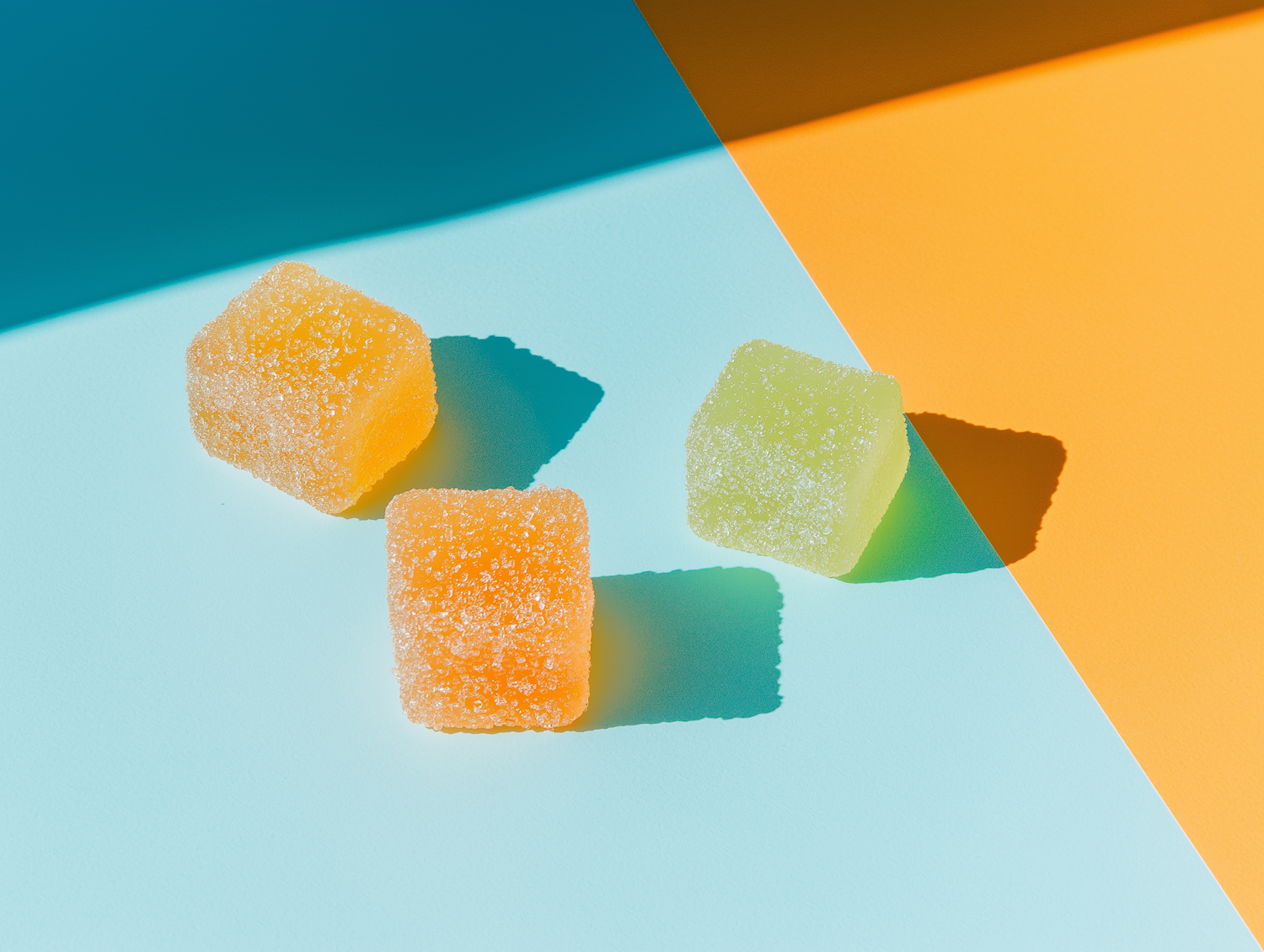 Vibrant sugar-coated gummy cubes on a colorful split background, showcasing bright orange and green hues with sharp shadows.