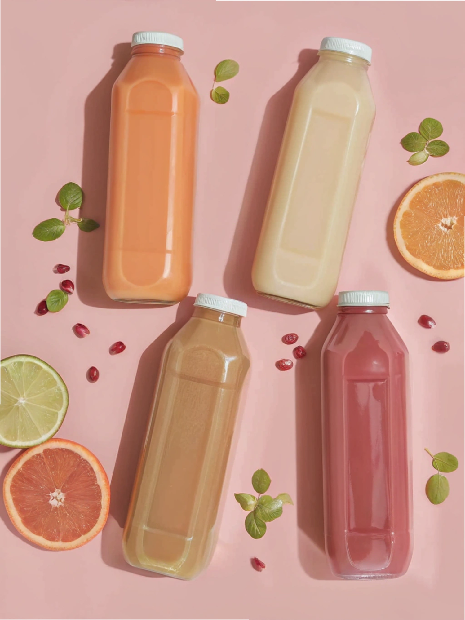 Colorful juice bottles with fresh fruit slices and mint leaves on a pastel pink background, showcasing vibrant and natural ingredients.