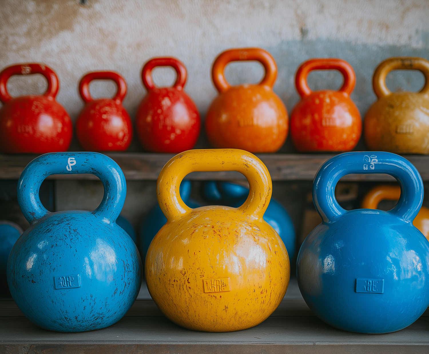 Colorful kettlebells on a wooden shelf, featuring blue, yellow, red, and orange hues, perfect for a vibrant gym setting.