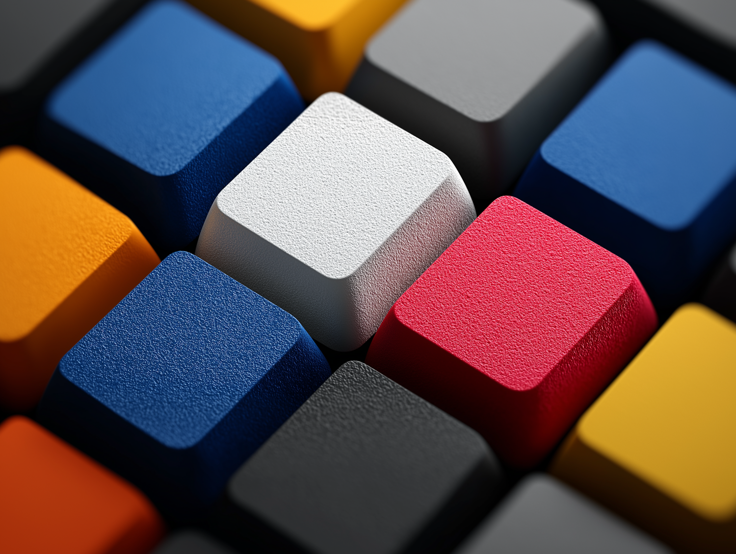 Close-up of colorful mechanical keyboard keycaps with a textured finish, featuring vibrant colors like red, blue, and yellow.