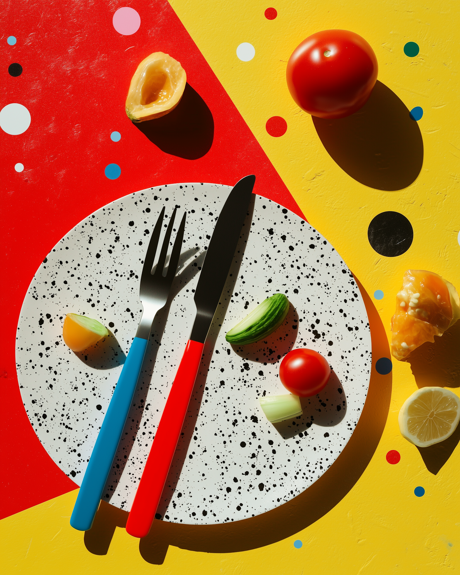 Colorful plate with cutlery and fresh veggies on a vibrant red and yellow background with playful dots.