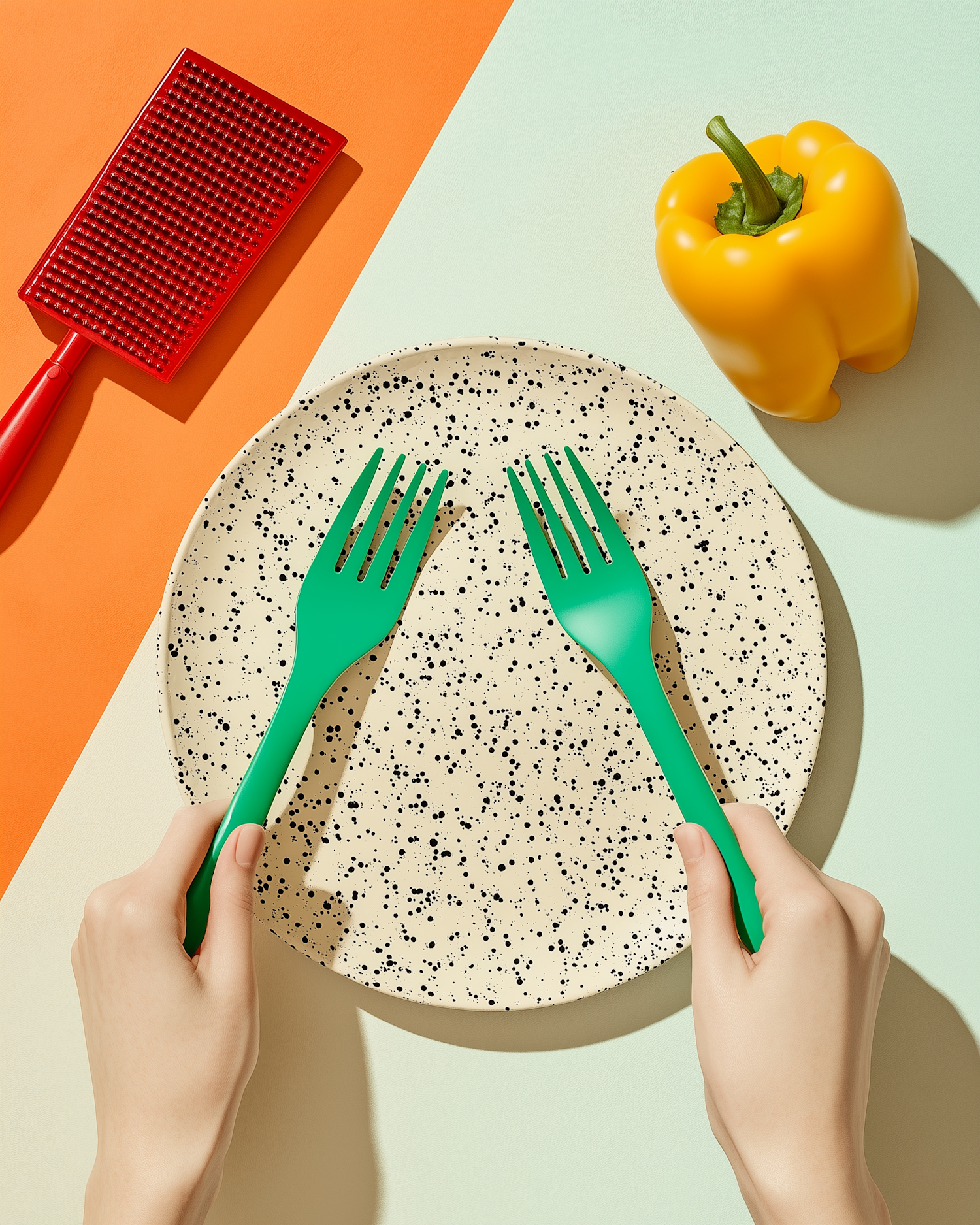 Colorful composition with a speckled plate, green forks, a red fly swatter, and a yellow bell pepper on vibrant backgrounds.