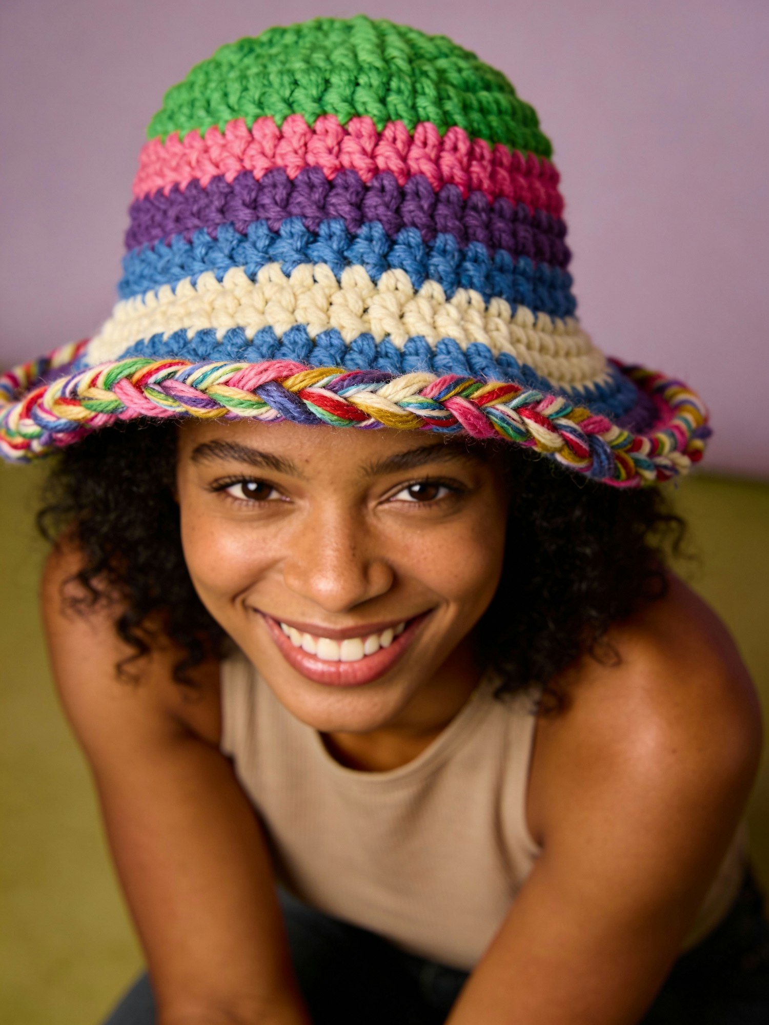 A smiling person wearing a vibrant, multicolored knitted hat with a braided brim, set against a soft pastel background.