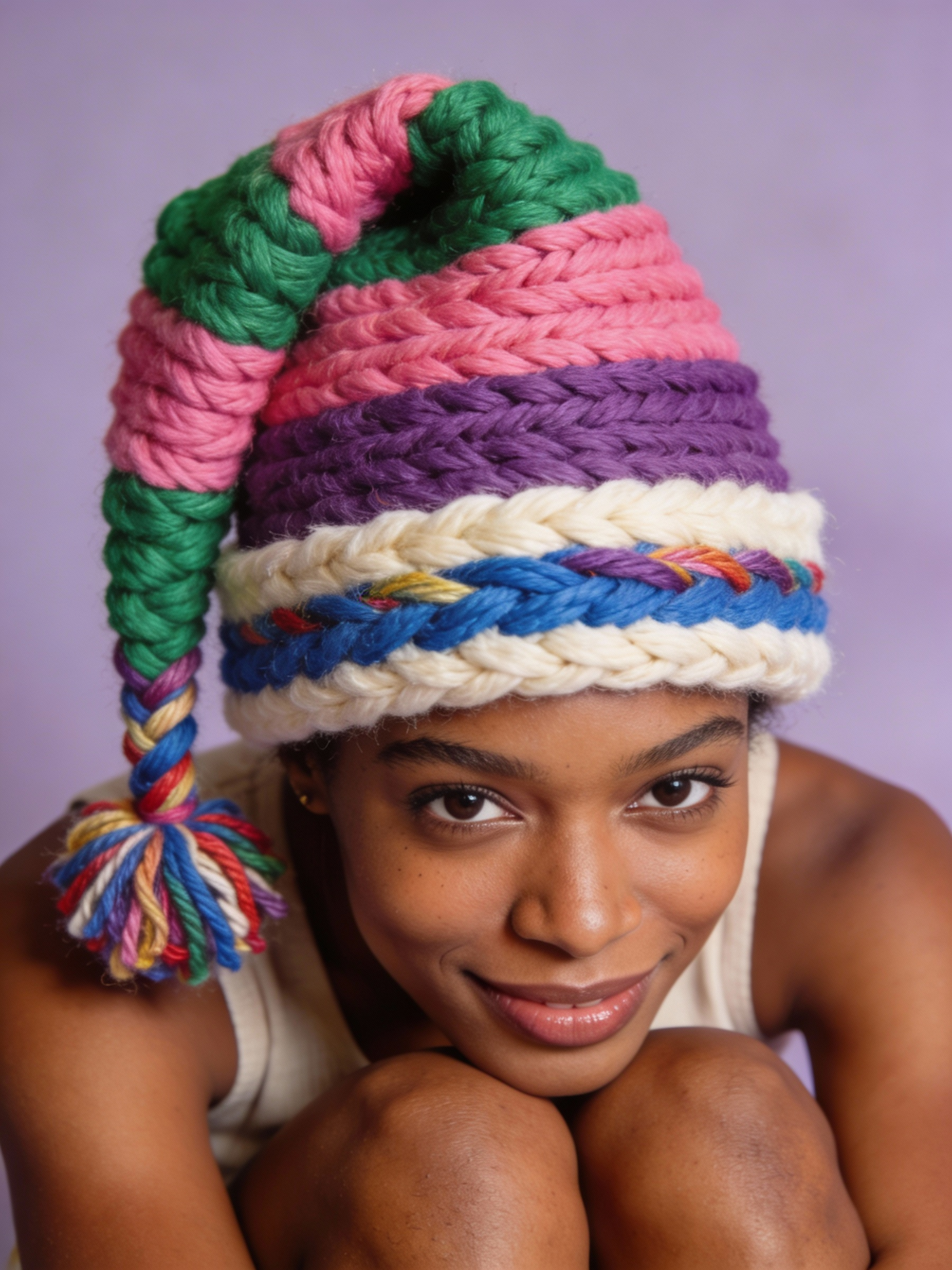 A Black woman with warm brown skin wears a vibrant, in a Santa hat The hat features horizontal stripes in a rich mix of yarns—green, pink, purple, blue, cream, and multicolored twisted fibers—creating a chunky, tactile texture that evokes playful artistry and bold self-expression. Her pose is relaxed and centered, allowing the hat’s sculptural silhouette and vivid palette to take focus. She wears a neutral-toned top to balance the visual intensity of the hat. The lighting is soft and natural, enhancing the yarn’s texture and the warmth of her skin. The background is a plain, complementary tone—either soft lavender, muted olive, or warm sand—to harmonize with both her complexion and the hat’s multicolor vibrancy. The mood is joyful and expressive, celebrating craft, color, and individuality with emotional depth and visual clarity.