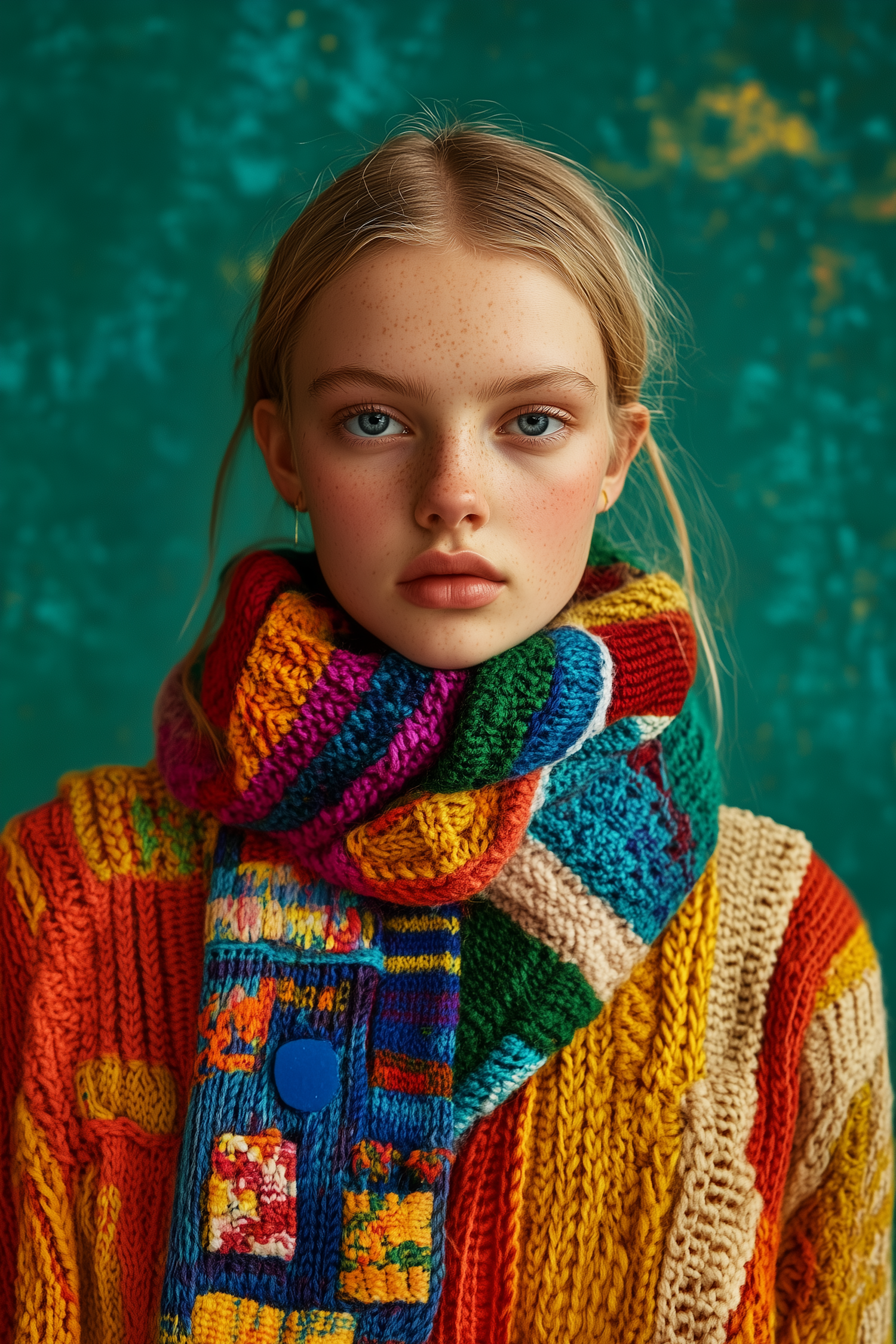 Young woman in colorful knitted scarf and sweater against a teal background, showcasing vibrant fashion and serene expression.