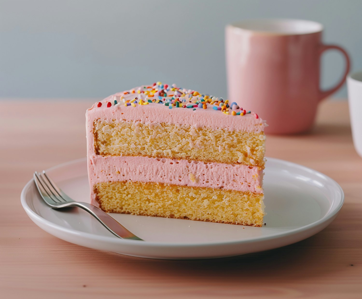 Delicious slice of vanilla cake with pink frosting and sprinkles on a white plate, accompanied by a pink mug in a cozy setting.