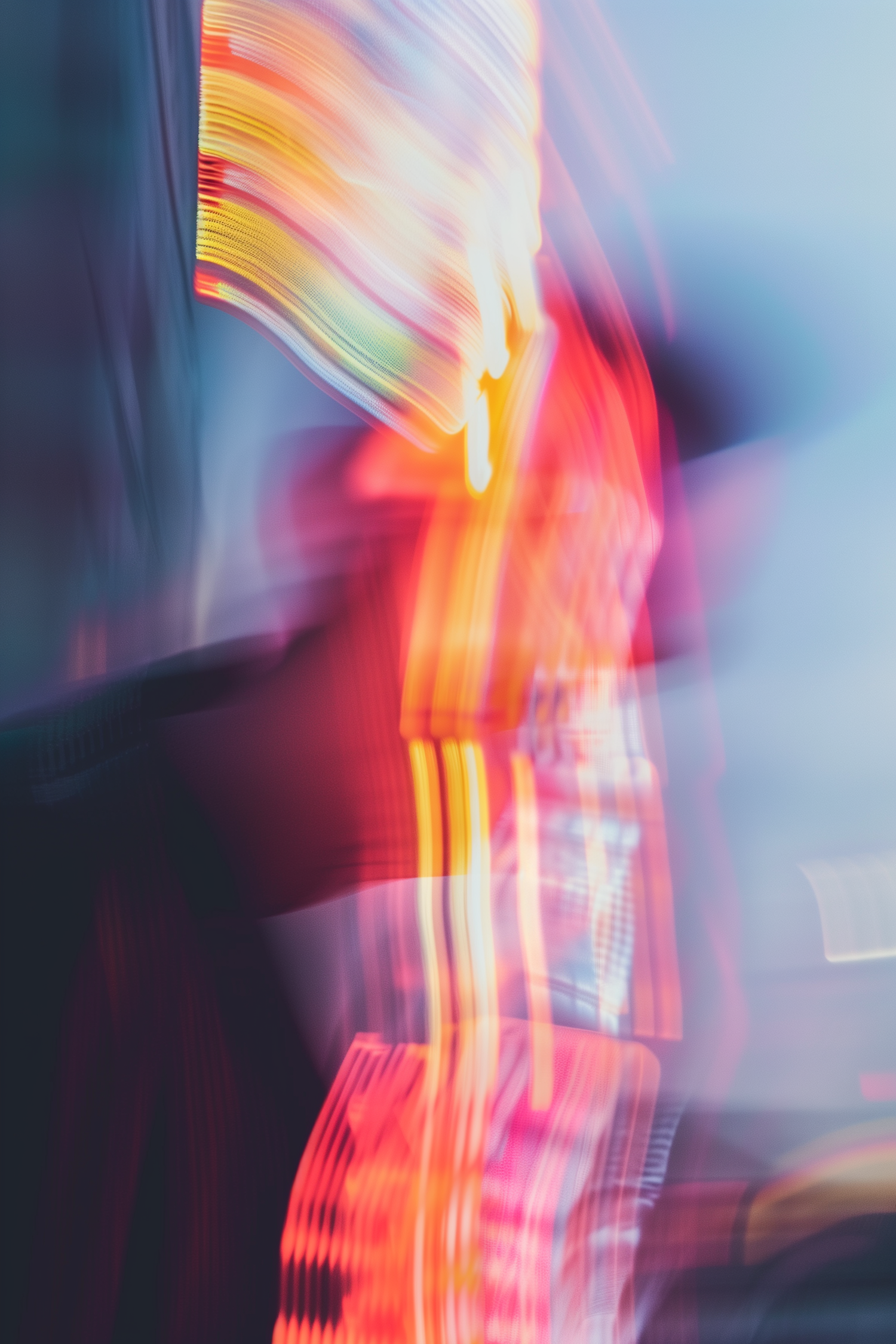 Abstract light trails in vibrant red, yellow, and pink hues with a blurred blue background, creating a dynamic and modern aesthetic.