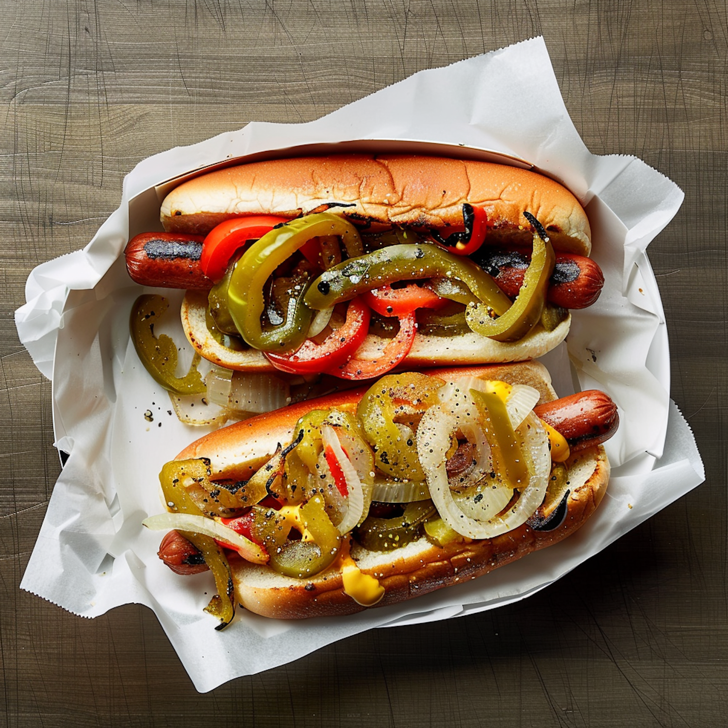 Grilled hot dogs with charred veggies, mustard, and toasted buns served on parchment paper for a rustic, appetizing presentation.