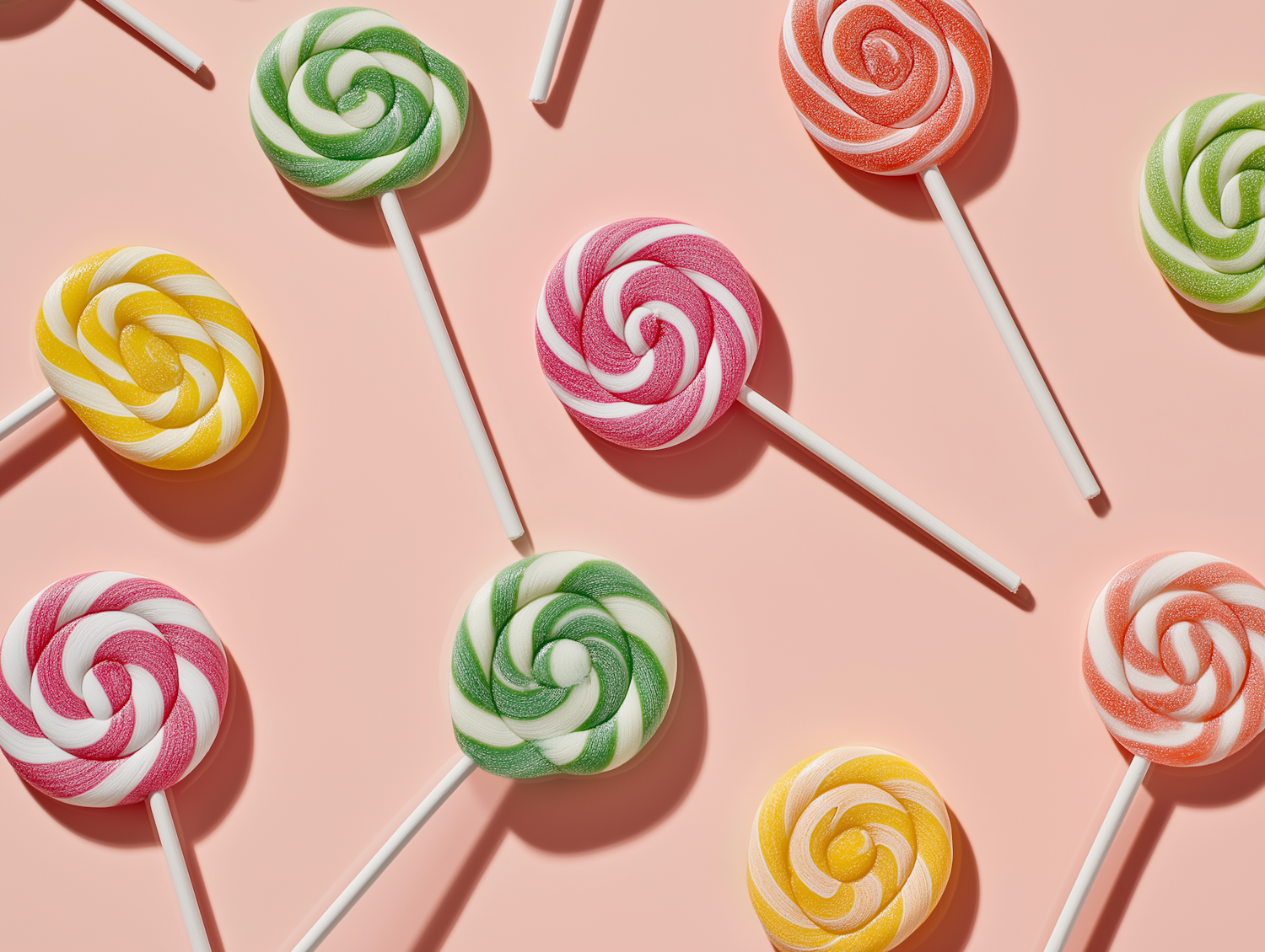 Bright swirl lollipops in green, yellow, pink, and orange on a pastel pink background. Perfect for candy lovers and colorful decor ideas.