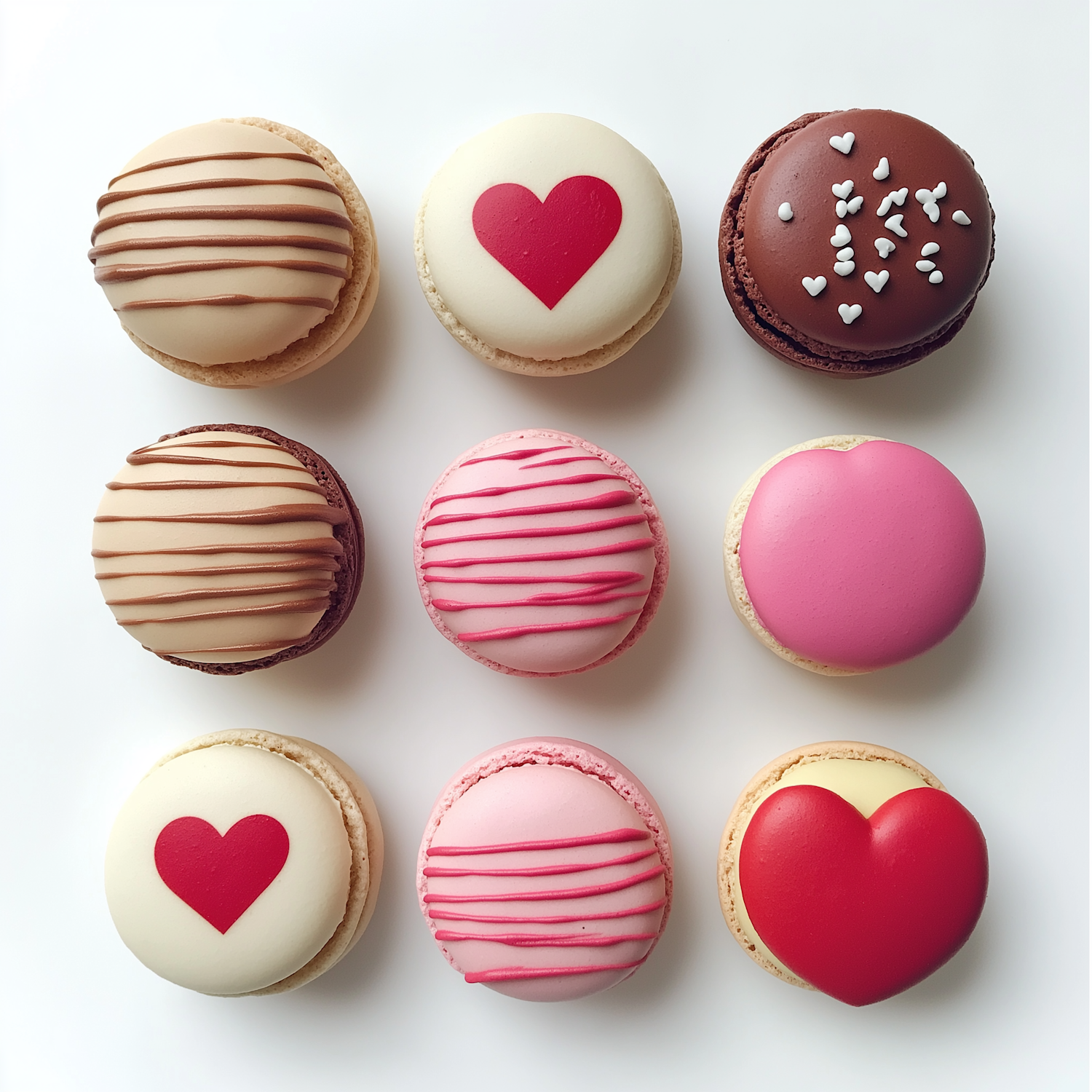 A grid of colorful macarons with heart designs, chocolate drizzles, and pink stripes, perfect for Valentine's Day or special celebrations.