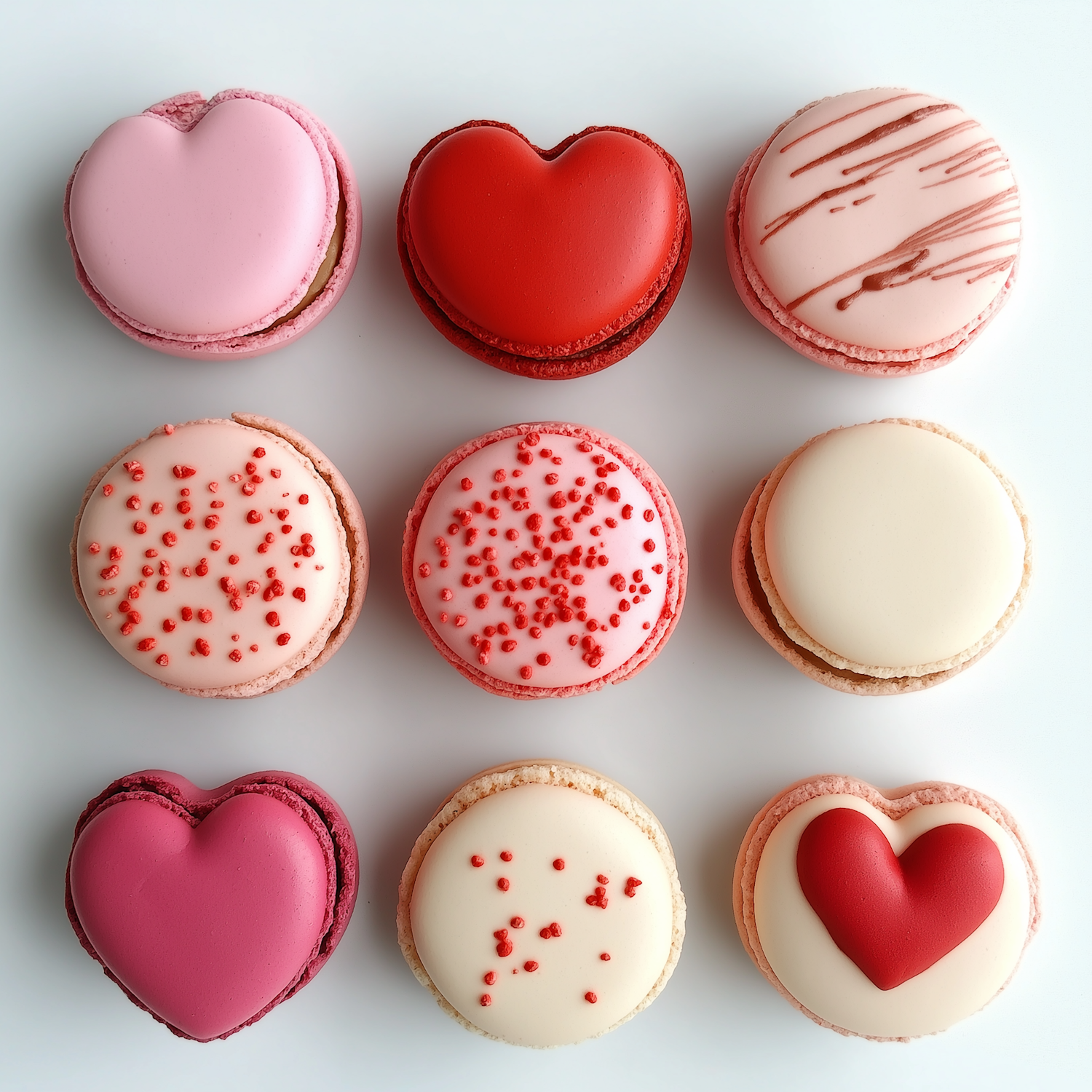 A grid of colorful heart-shaped and decorated macarons, perfect for Valentine's Day or special occasions.