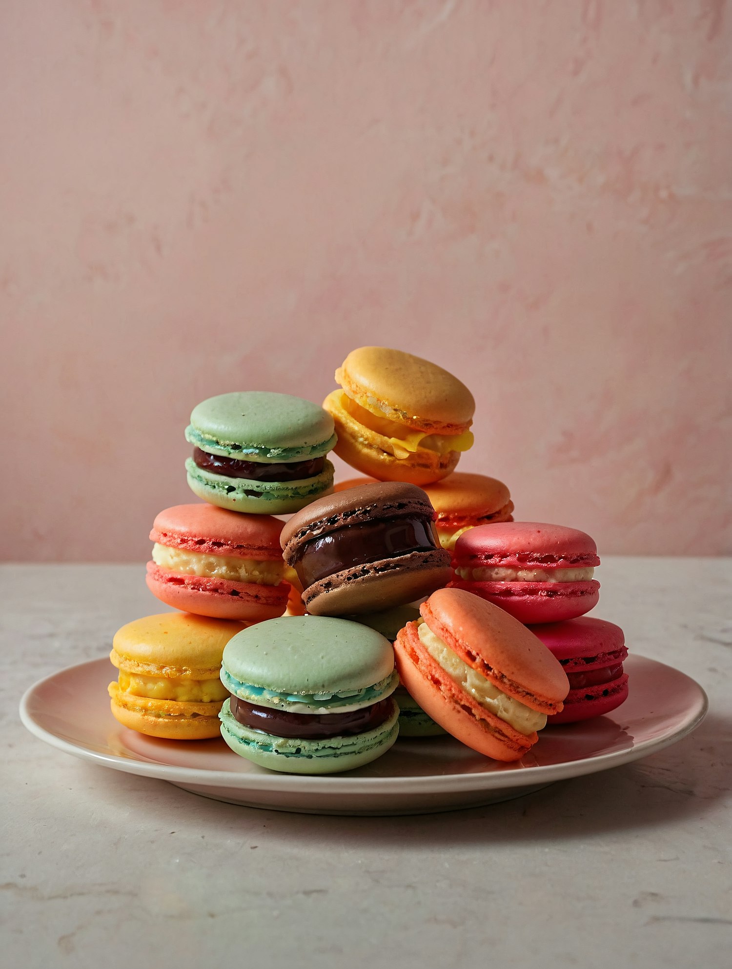 A plate of vibrant macarons in pastel green, yellow, orange, pink, and chocolate brown, stacked on a marble surface with a pink backdrop.