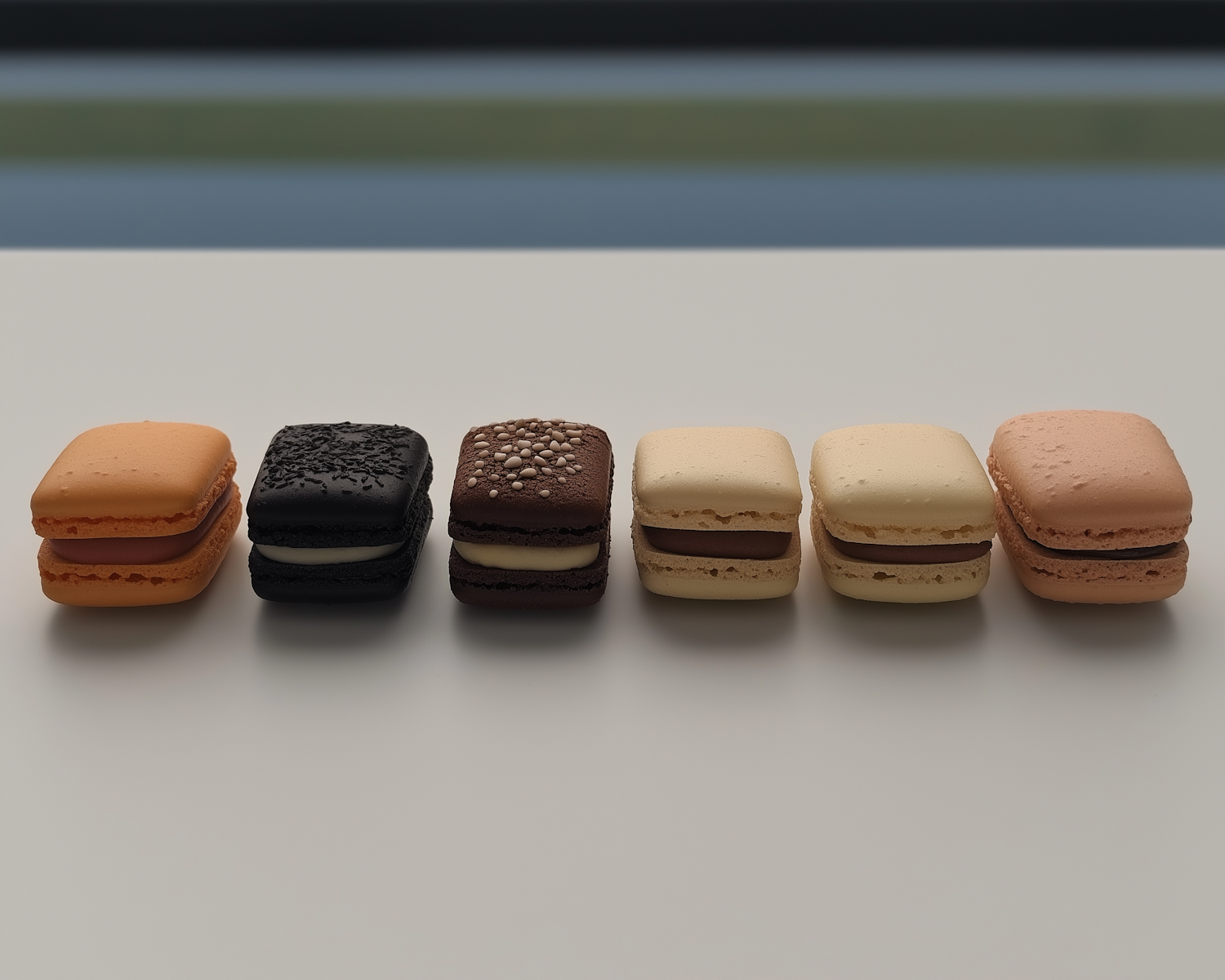 A row of six colorful rectangular macarons with varied textures and fillings on a light surface.