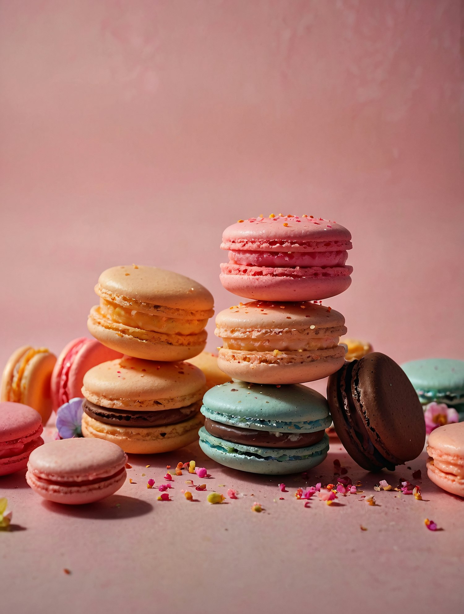 Colorful macarons in pastel shades with sprinkles, arranged on a pink surface with scattered petals for a whimsical dessert vibe.