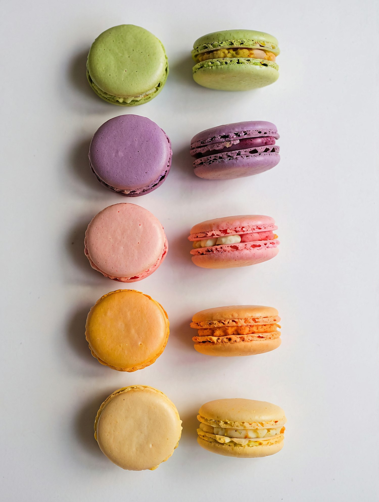A neat arrangement of colorful macarons in pastel shades of green, purple, pink, orange, and yellow on a white background.