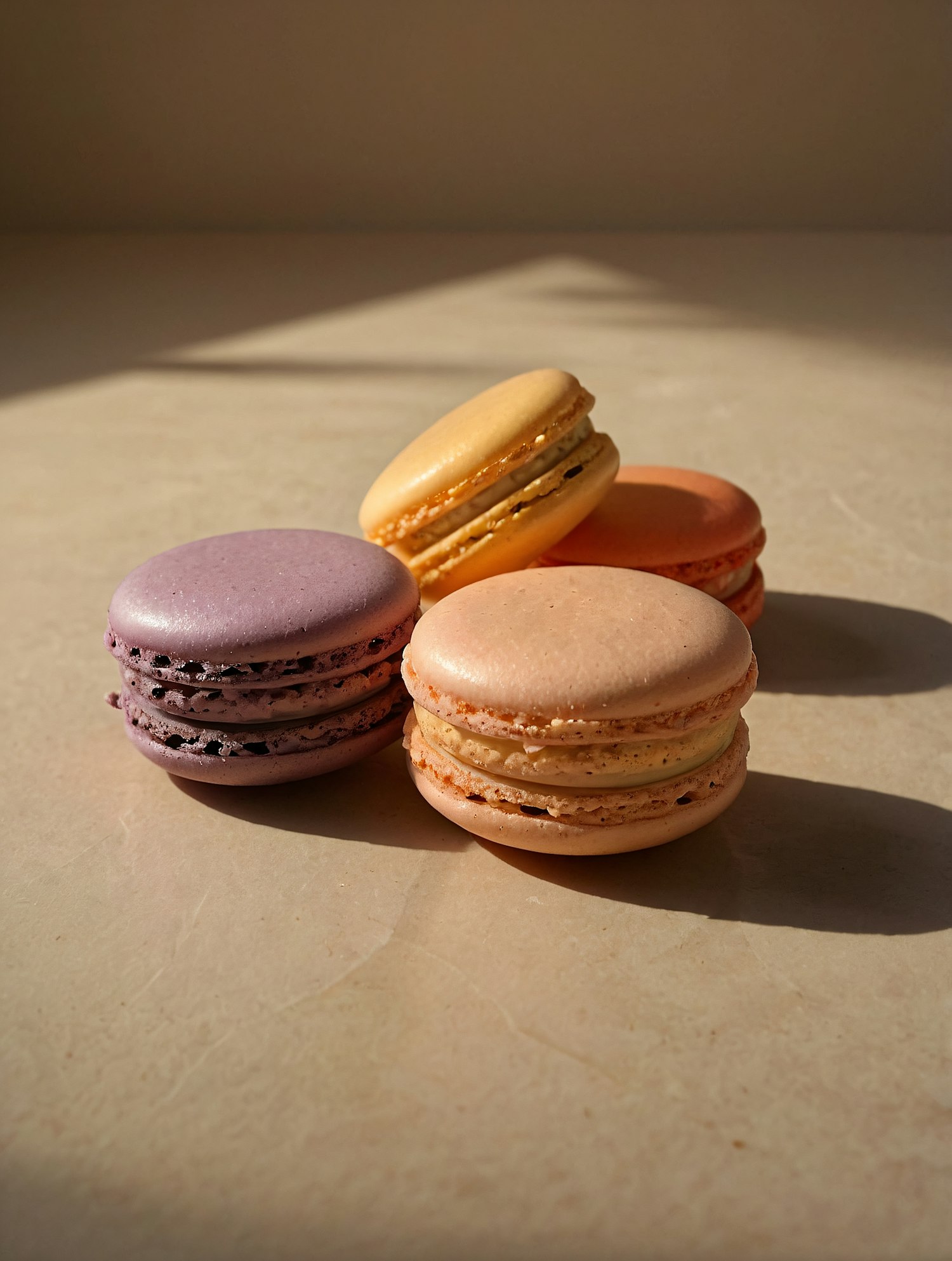 Four colorful macarons in lavender, peach, yellow, and orange on a beige surface, beautifully lit by soft natural light.