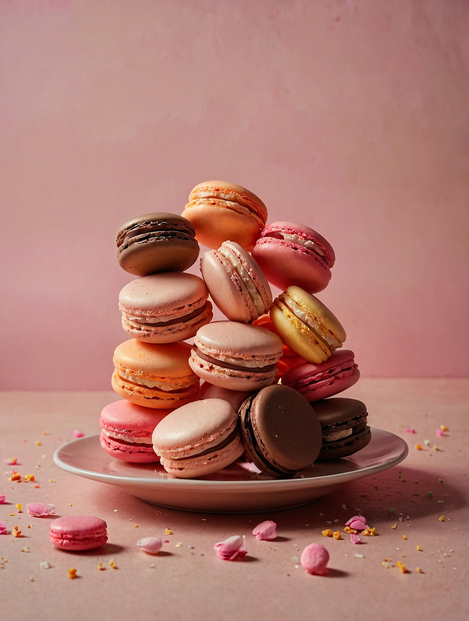 A stack of colorful macarons on a white plate with a pink background, featuring pastel shades and scattered crumbs for a whimsical touch.