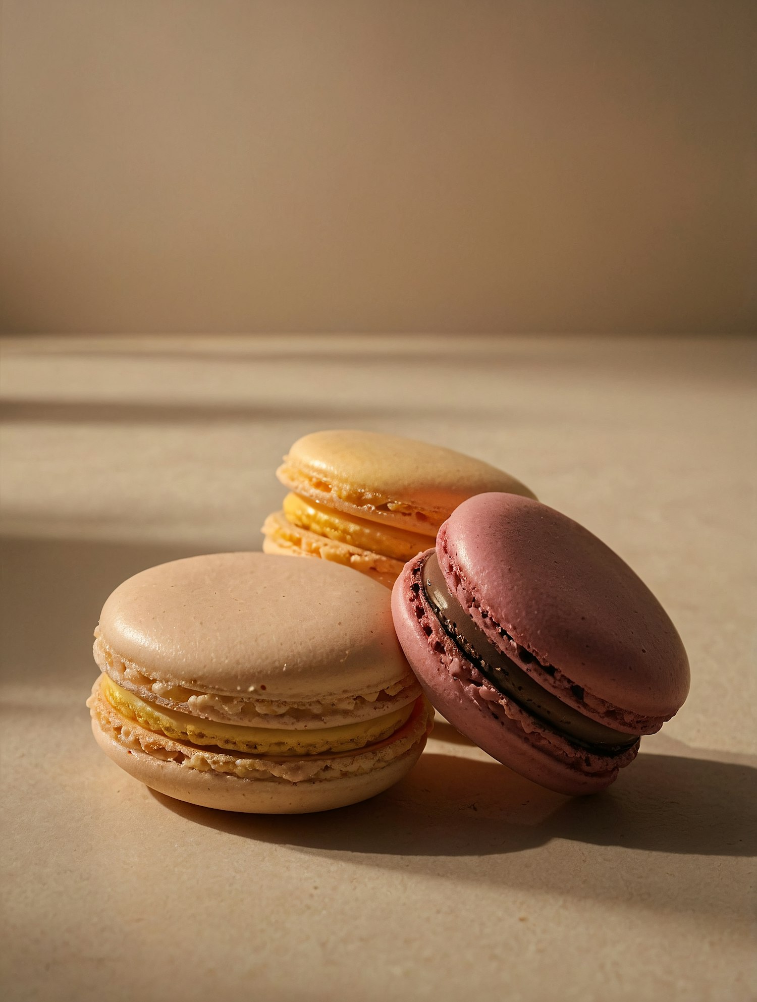 Three pastel macarons in pink, beige, and yellow-orange hues on a beige surface, bathed in warm natural light.