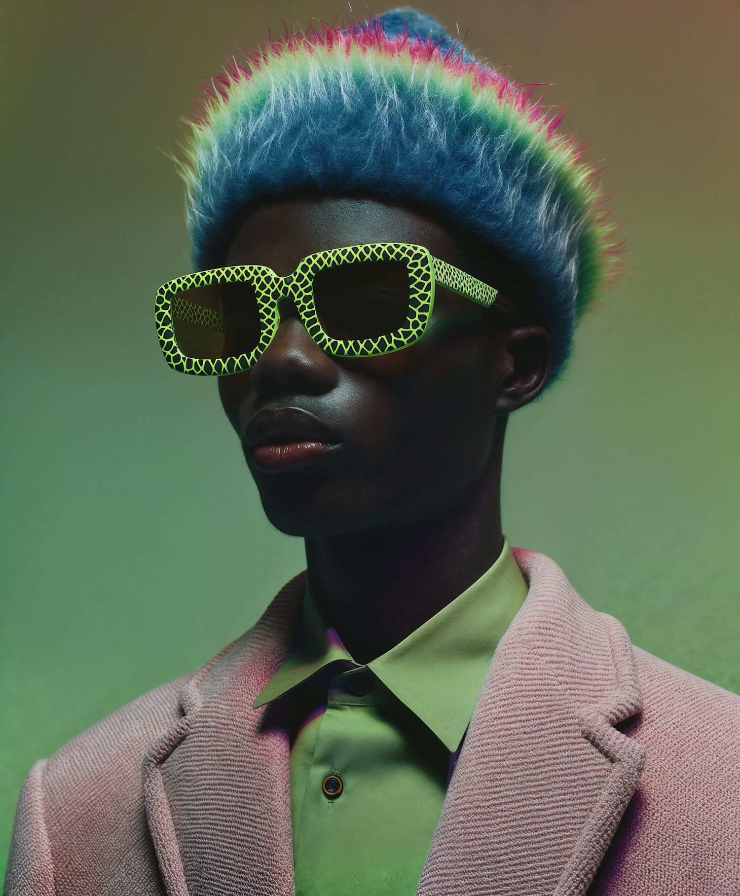 Stylish portrait of a man in neon green sunglasses, a colorful fuzzy hat, and a pink blazer over a green shirt.