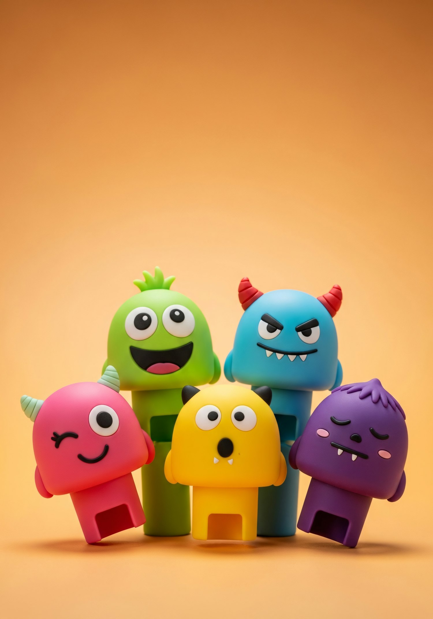 A group of colorful, cartoonish monster figurines with unique expressions and designs, set against a warm orange background.
