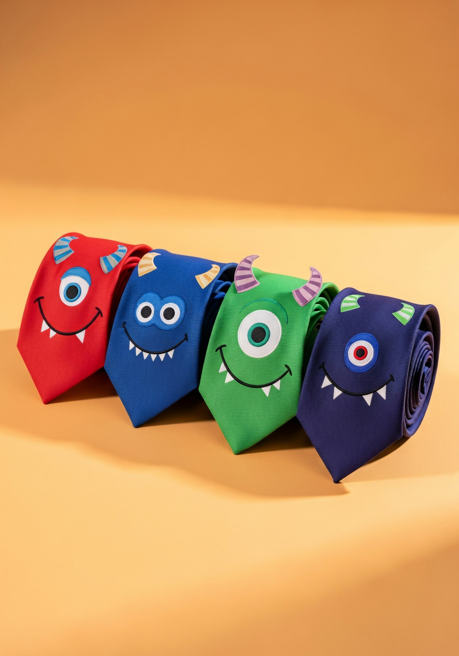Four colorful ties with playful monster designs, featuring unique expressions and vibrant colors, displayed on an orange background.