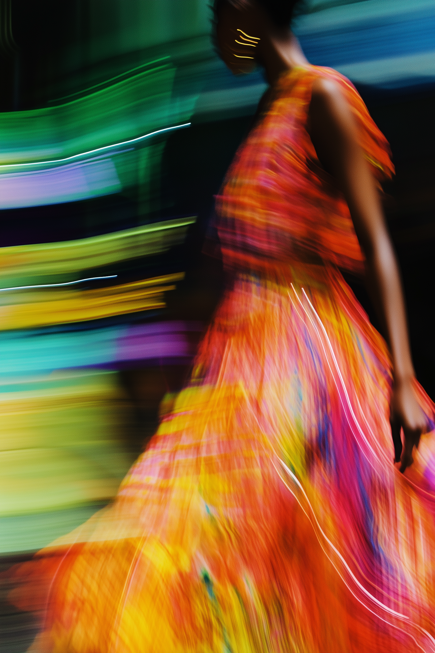 A blurred motion shot of a person in a vibrant, multicolored dress against a streaked, colorful background, creating a dynamic visual.