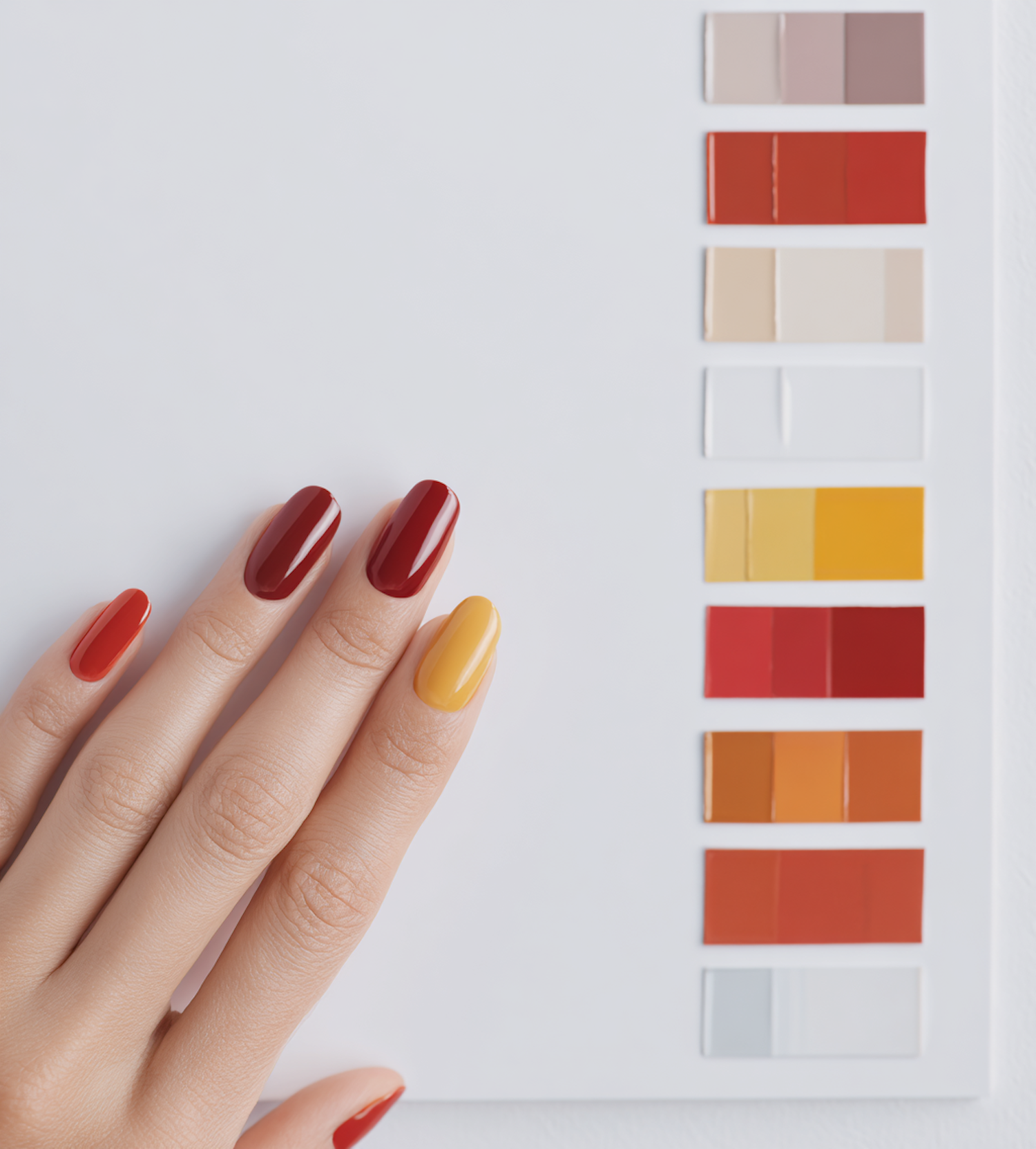 Close-up of painted nails matching color samples on a chart, displaying vibrant red, burgundy, and yellow shades. Artistic palette choices.