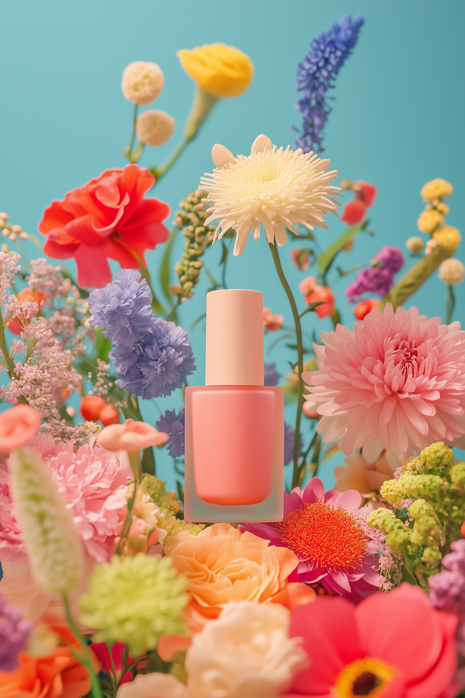 Coral pink nail polish bottle surrounded by vibrant flowers in pink, yellow, and purple hues, set against a turquoise background.