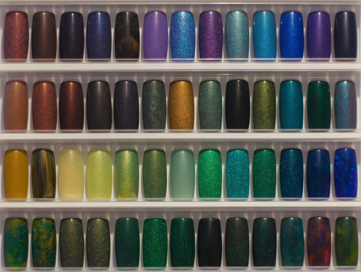 A vibrant nail sampler in different colors and finishes, neatly arranged in rows for visual appeal.