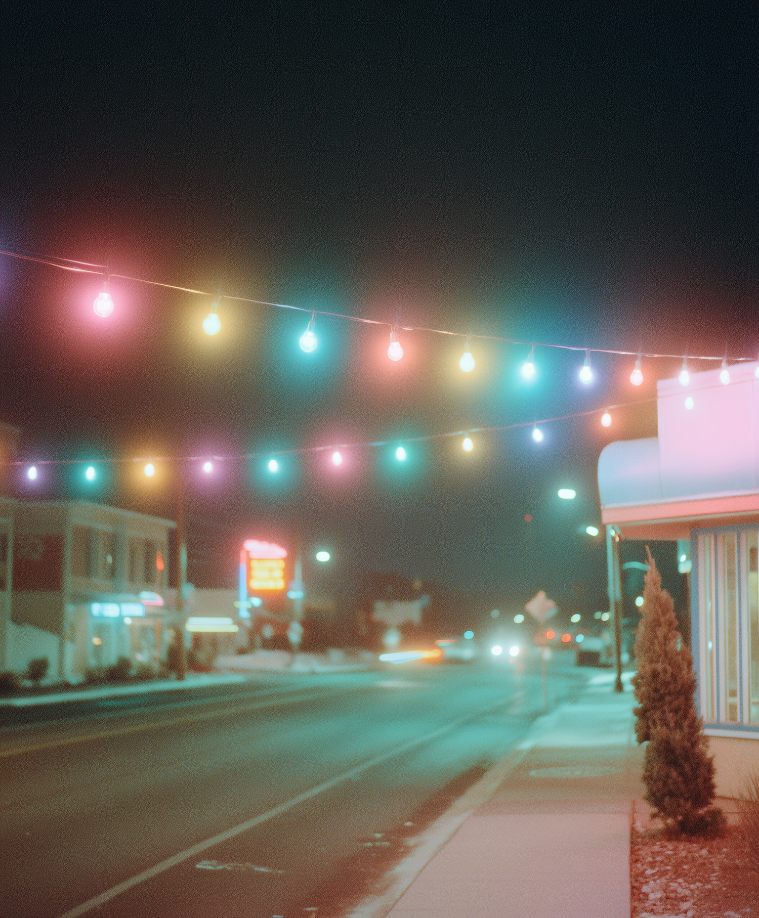 A quiet street at night adorned with colorful string lights, creating a festive and serene atmosphere with minimal traffic.