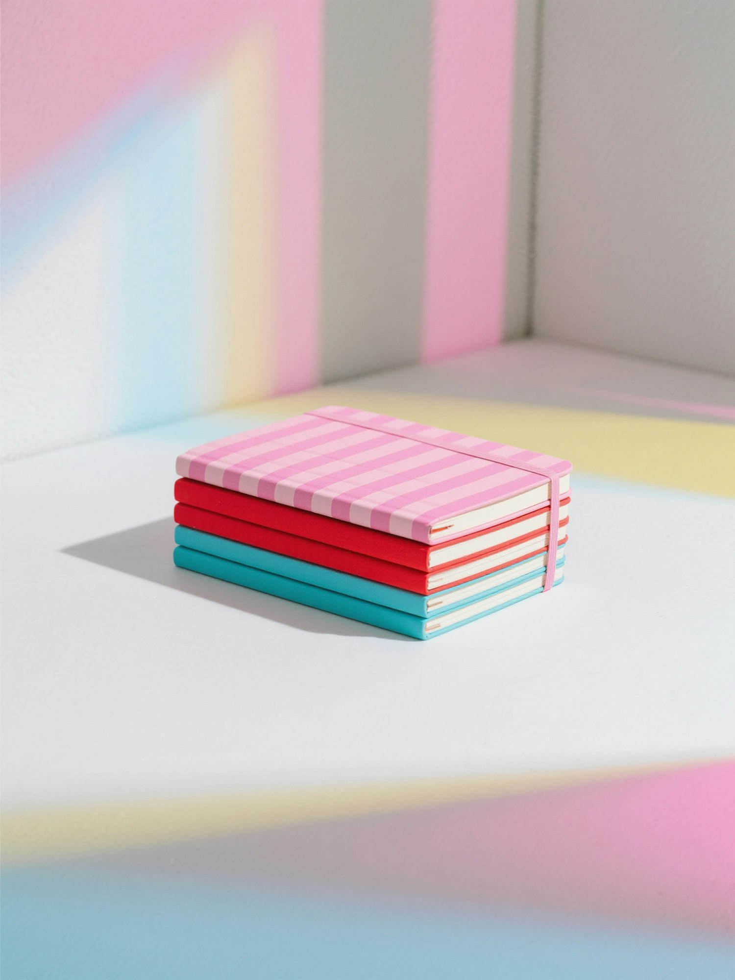 A bold and playful studio scene with bright pastel lighting, soft shadows, minimal background. Color palette limited to soft pink, baby blue, off-white, pale yellow and pop red. Smooth surfaces, clean layout, flat lay or isometric compositions, fun and modern vibe, high resolution. Stacked notebooks with graphic covers using grid and striped patterns in pastel pink, red, and blue, arranged neatly against a white wall.