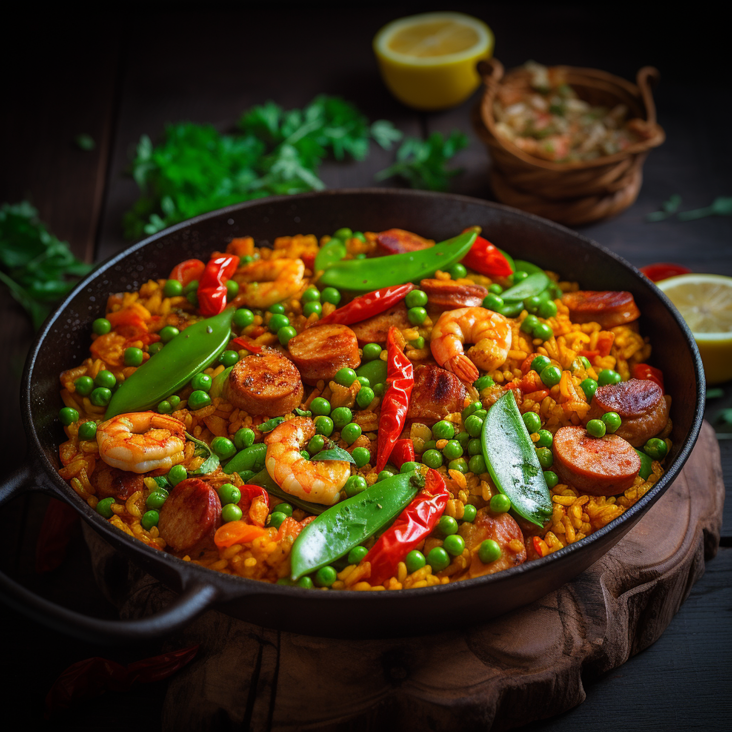 Delicious paella with shrimp, chorizo, peas, and peppers in a cast iron pan. Vibrant colors and fresh ingredients make it irresistible.