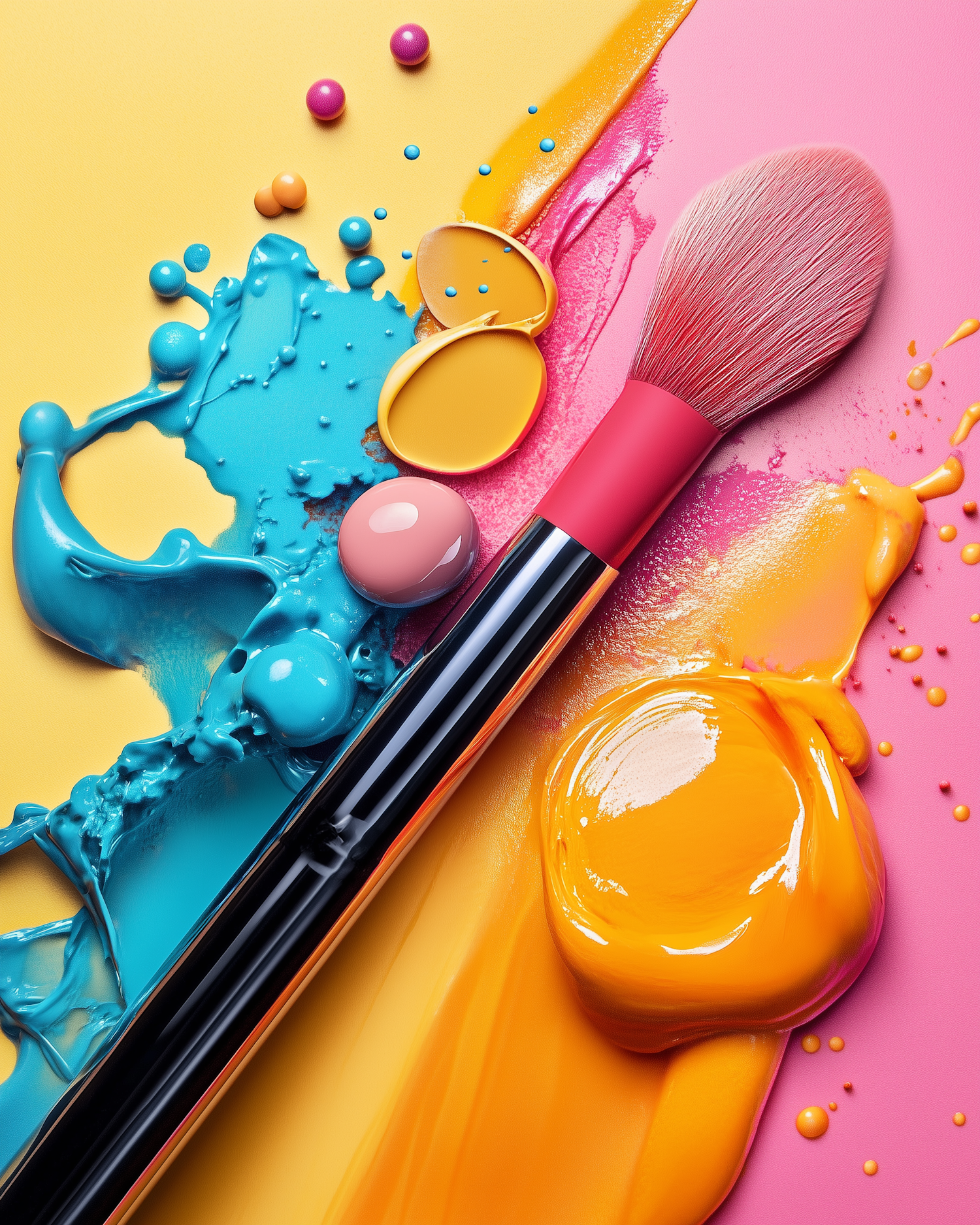 Vibrant makeup brush on a colorful background with splashes of blue, yellow, and orange paint, creating an artistic composition.